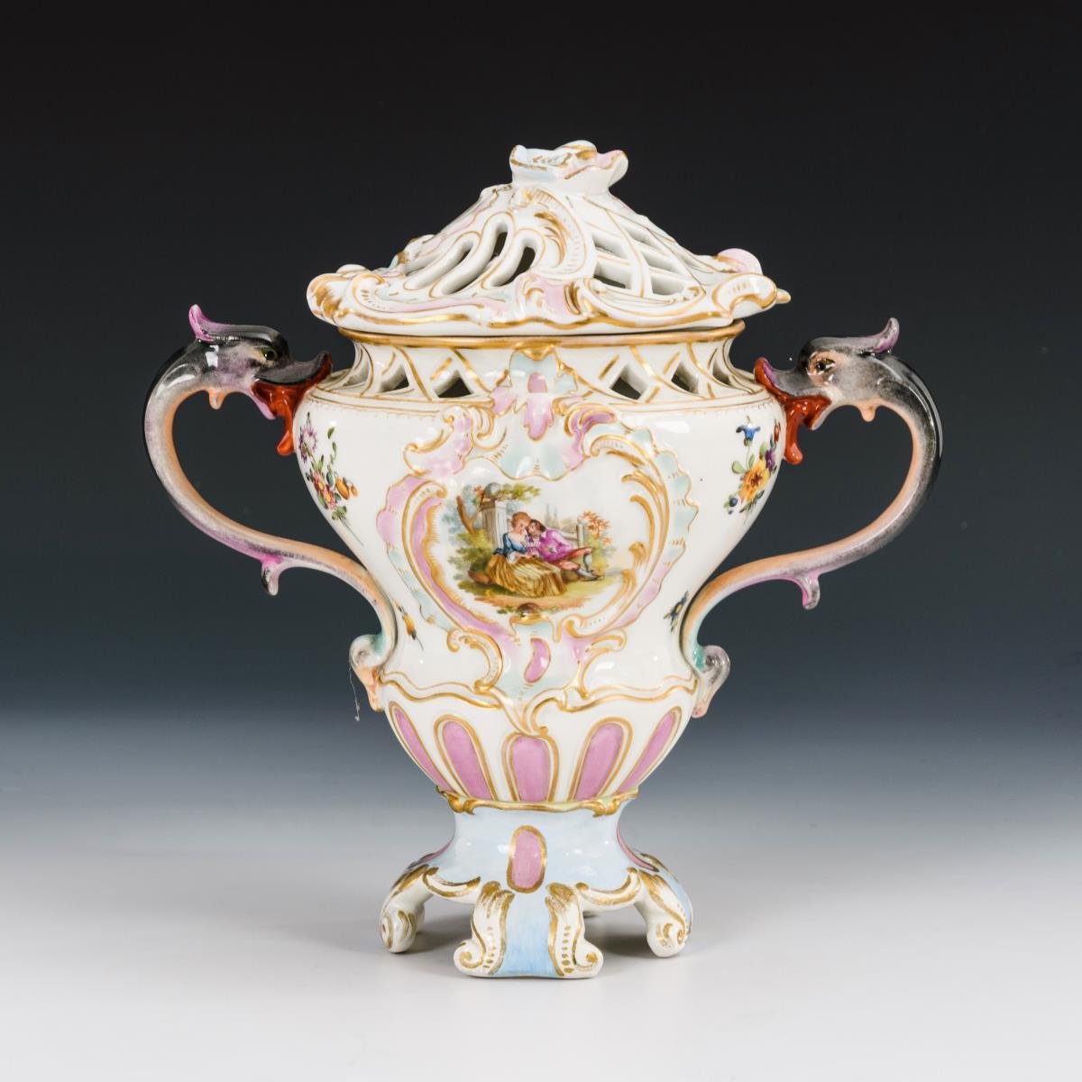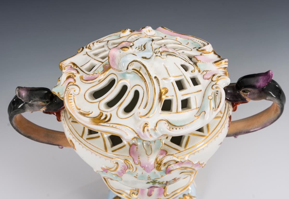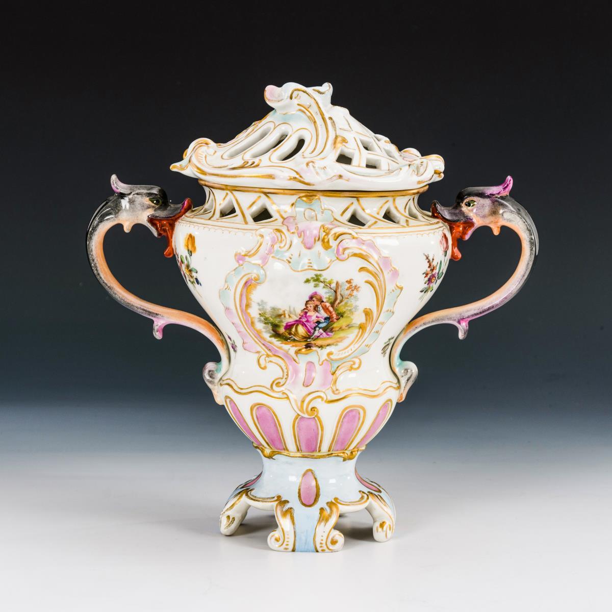 Balustervase mit zwei Drachenkopfhenkeln, Rocaillerelief sowie durchbrochener Schulter und Deckel. Beidseitig eine galante Szene. Deckelknauf und Fuß restauriert.