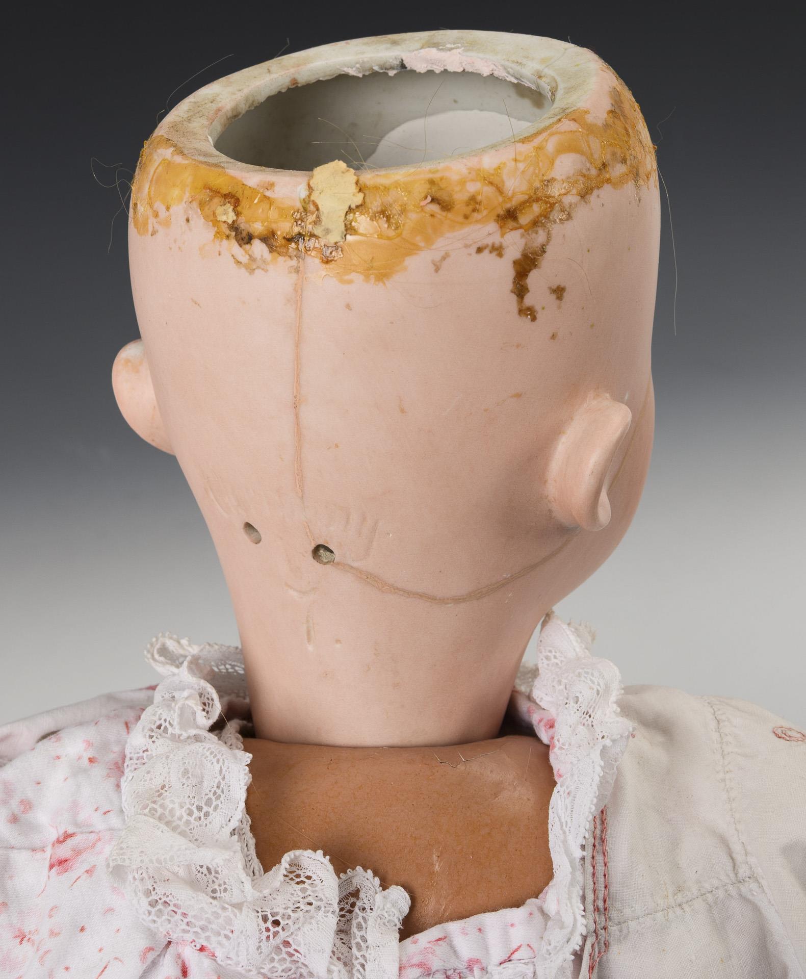 Beide mit Kurbelkopf, Glasaugen, Perücke und mehrteiligem Gliederkörper. 1x S & H/ K & R mit weißem Kleid, L 64 cm. 1x blond mit defektem Kopf ("Germany 7") und übermaltem Körper, L 73 cm.