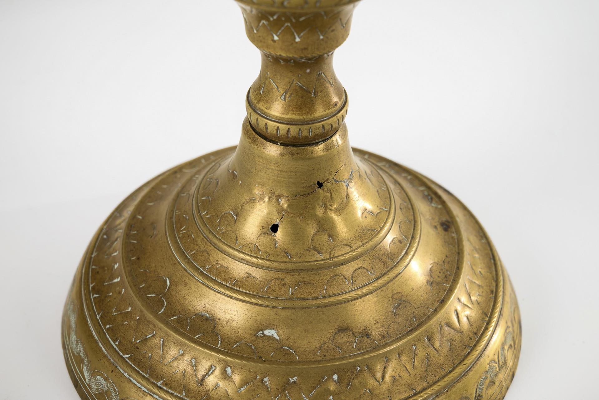 Schale mit Fischblasenmotiv und dreifache Umschrift in gotischen Minuskeln: "Sei mit uns Got". / Großer Kragenleuchter mit reicher Punzierung auf gestuftem Rundfuß, Balusterschaft, Tropfschale und hoher Tülle mit Nodus. / Kleiner Kupfertopf mit angenieteten Eisen-Beinen sowie Kupfer-Attaschen für den Eisenhenkel. Schale minimal verbeult, Leuchter Knickspur, Haarrisse und kleine Löcher am Fuß, Topf starke Alter-/Gebrauchsspuren.