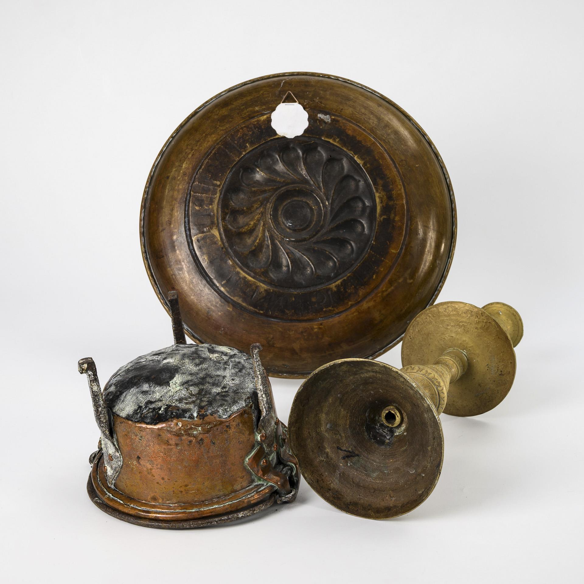 Historismus-Beckenschlägerschüssel, Kerzenleuchter und Kupfertopf.