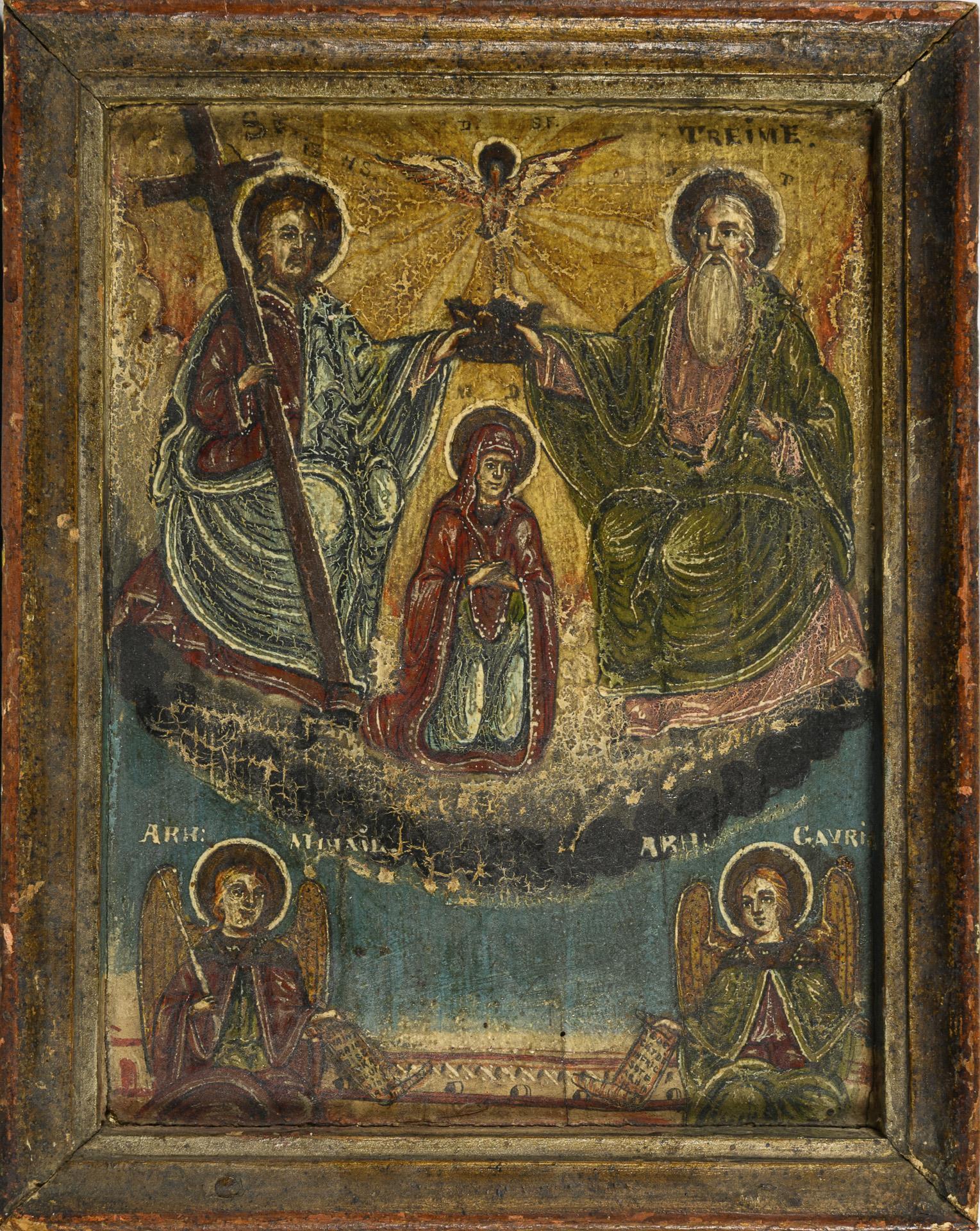 Jesus und Gottvater krönen Maria im Himmel. Altersspuren.