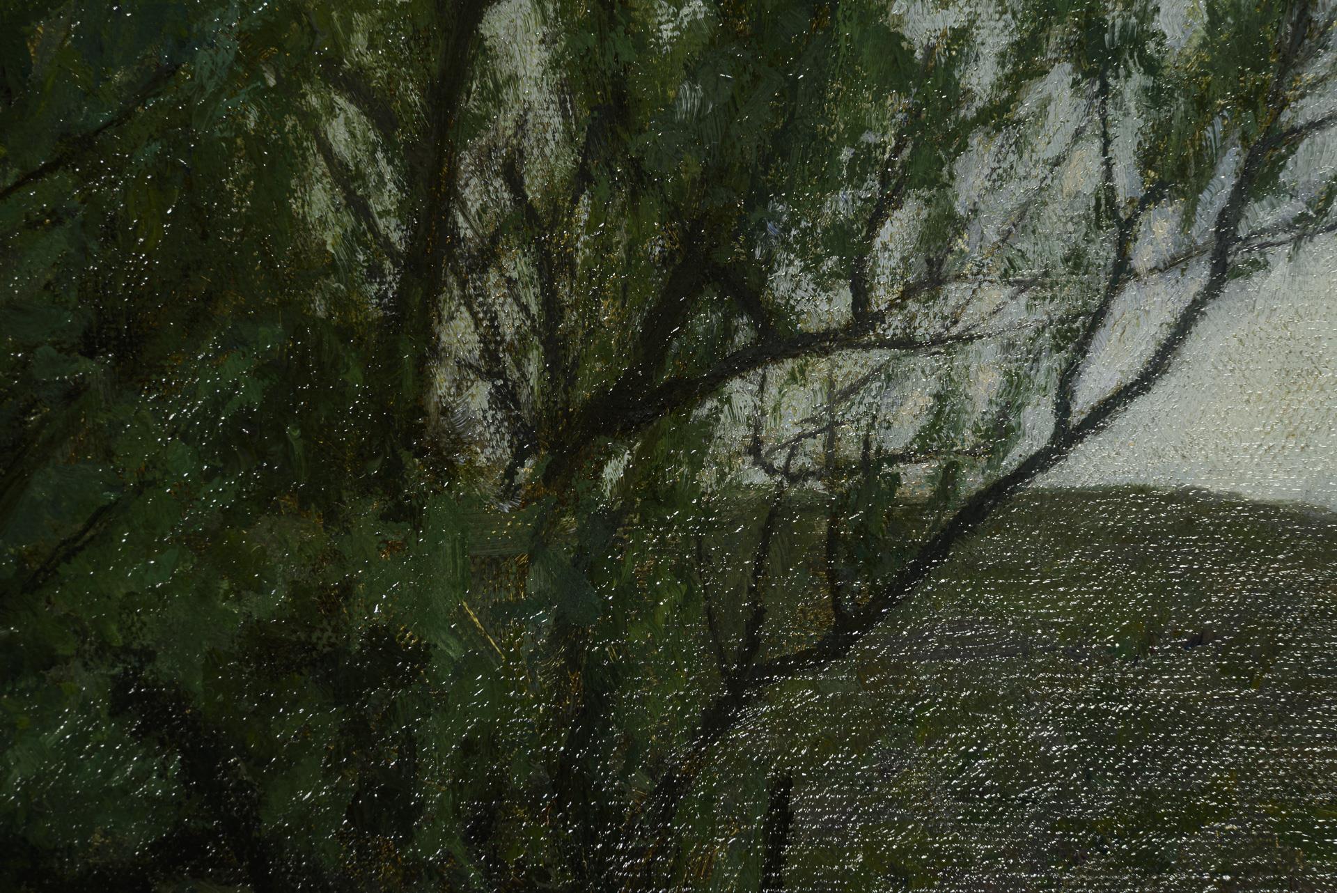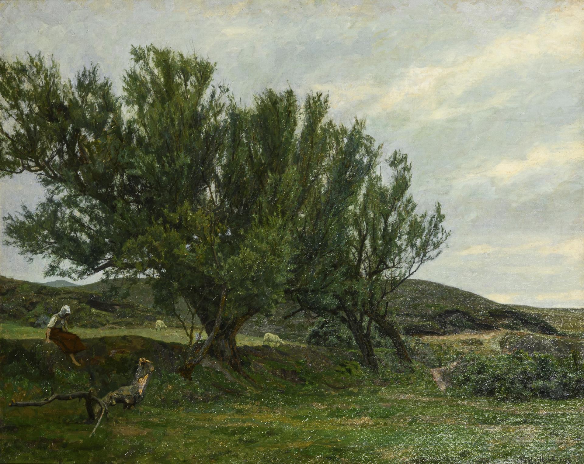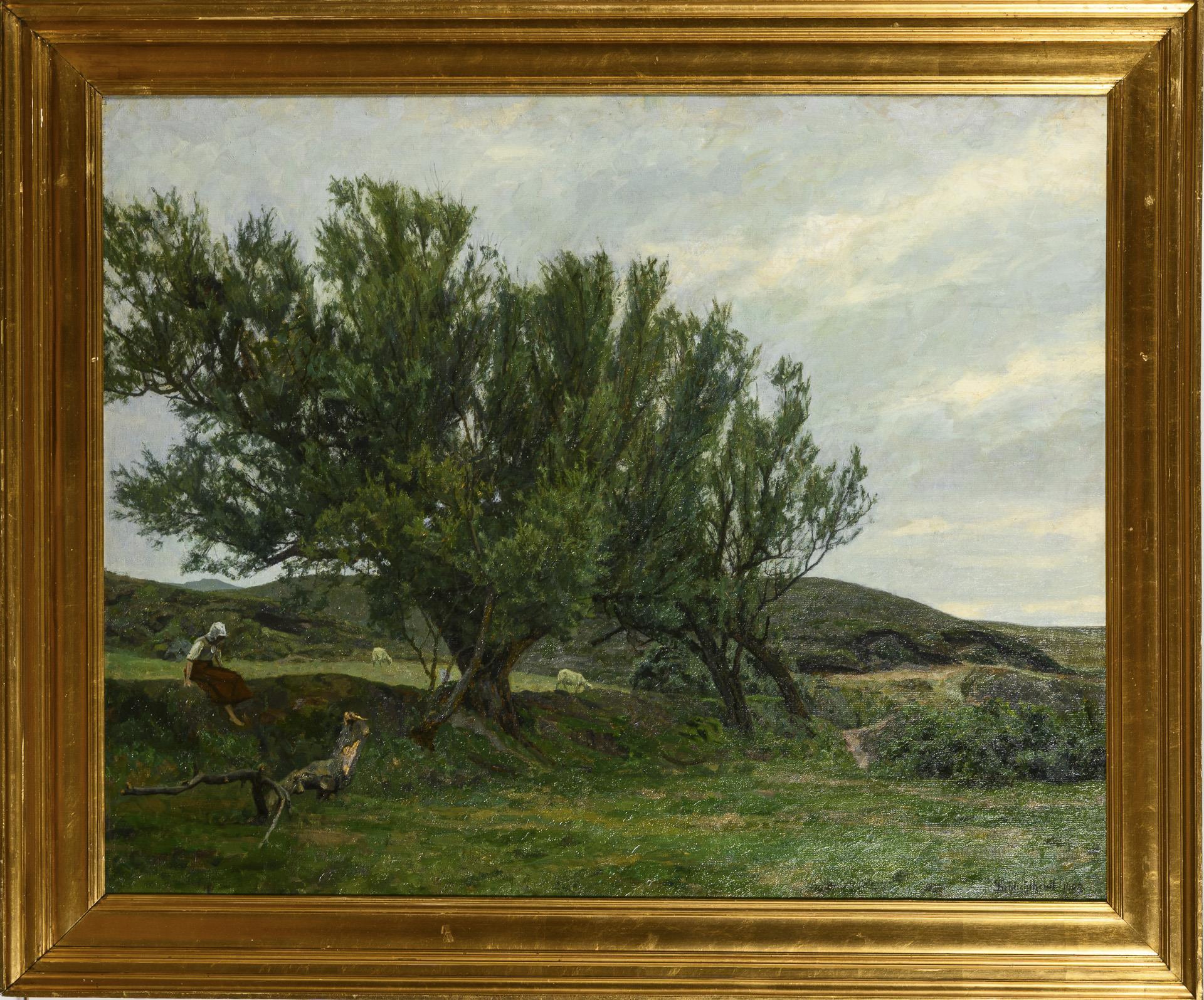 Die junge Frau auf einer Wiese mit den Schafen bei einer Baumgruppe unter wolkigem Himmel. Eine sehr kleine restaurierte Stelle mit Hinterklebung.