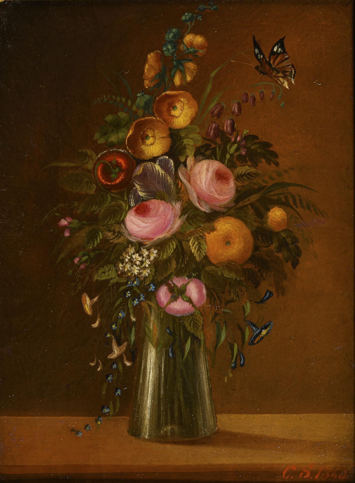 Schöner Blumenstrauß in schlanker Vase auf einem Sims mit heranfliegendem Schmetterling. Sehr kleine restaurierte Stellen mit Hinterklebungen.