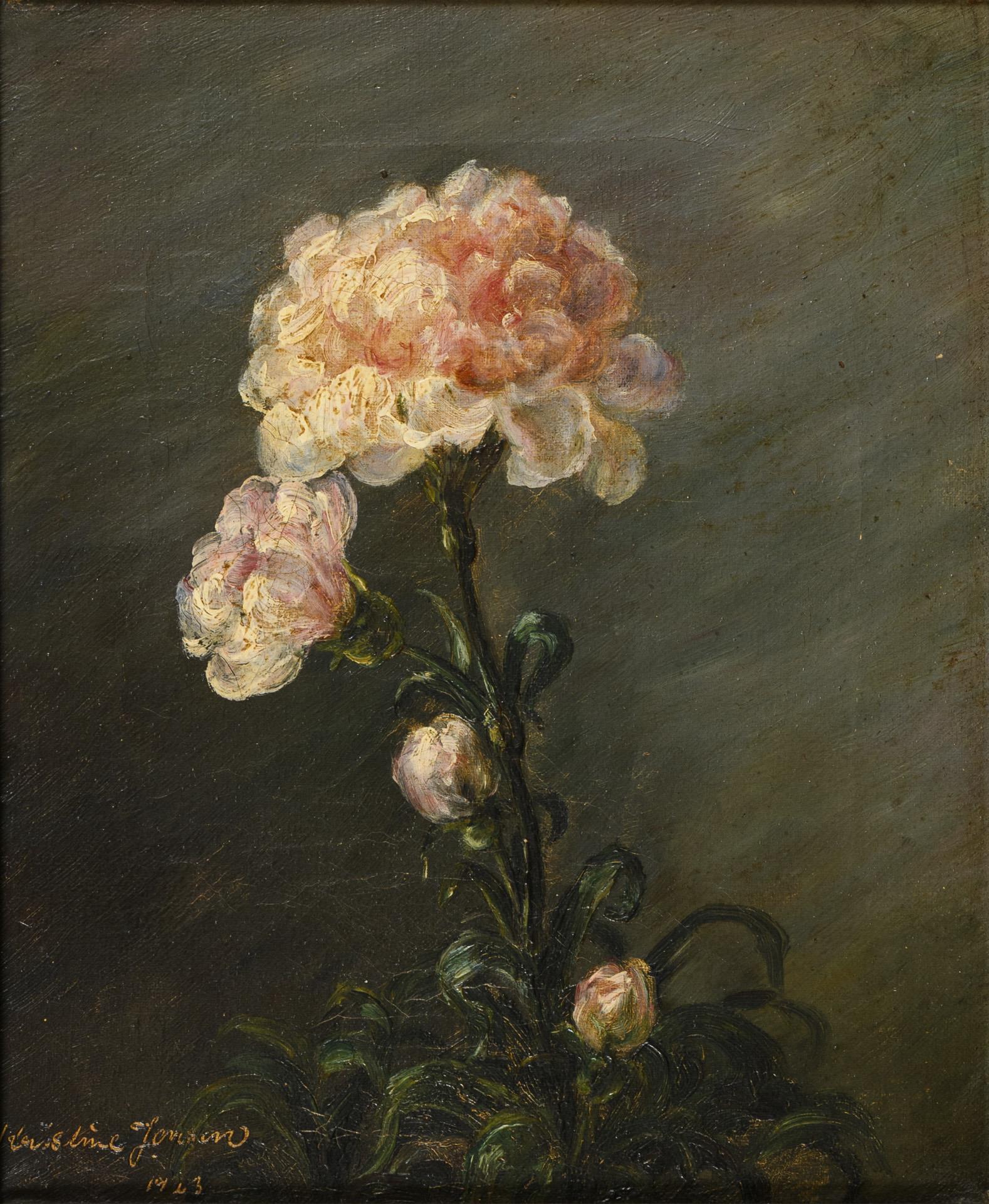 Die Blume mit rosafarbenen Blüten vor neutralem Hintergrund. Leichte Altersspuren.