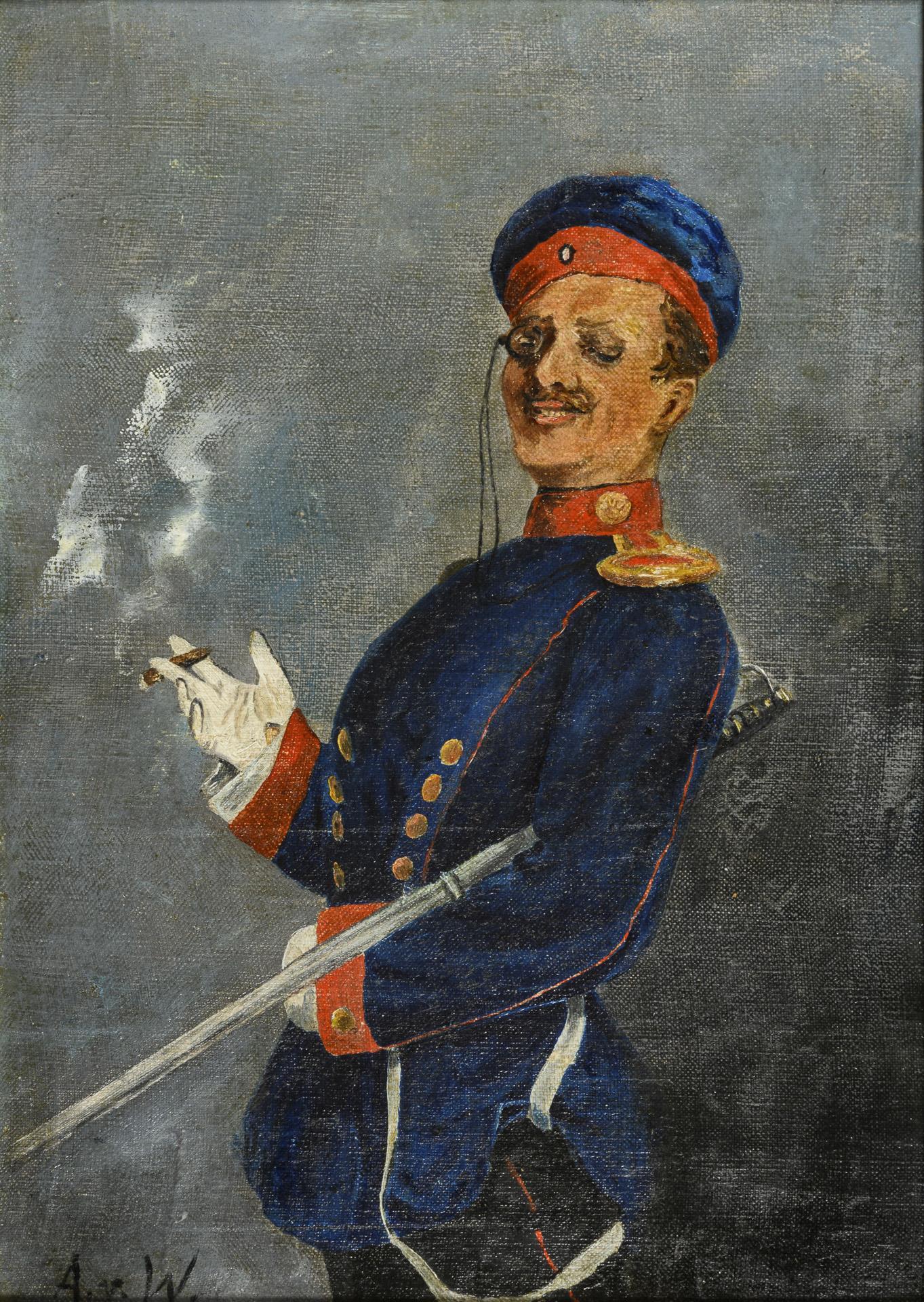 Sergeant der preußischen Ulanen in scherzhafter Haltung mit Zigarre und Degen.