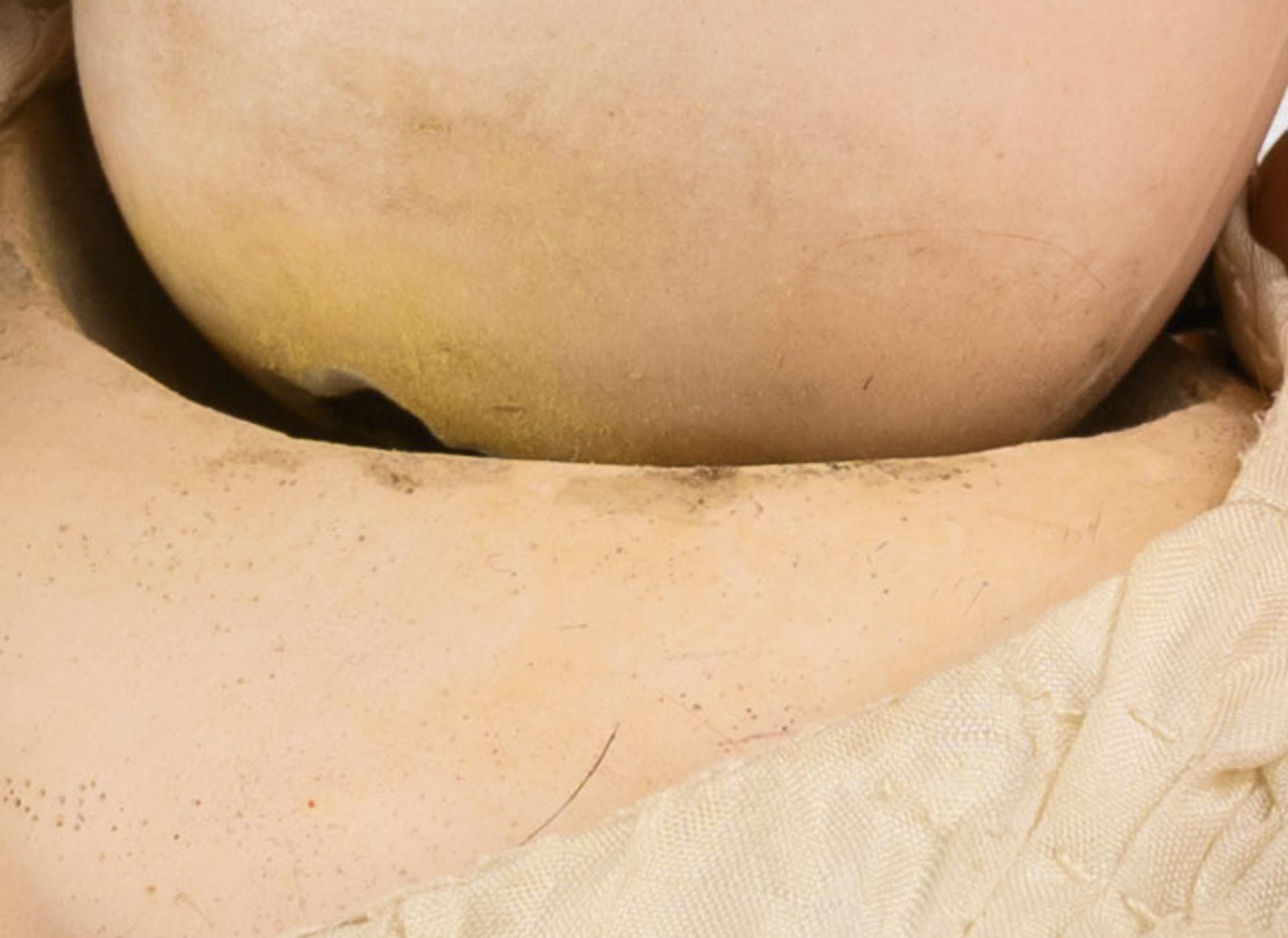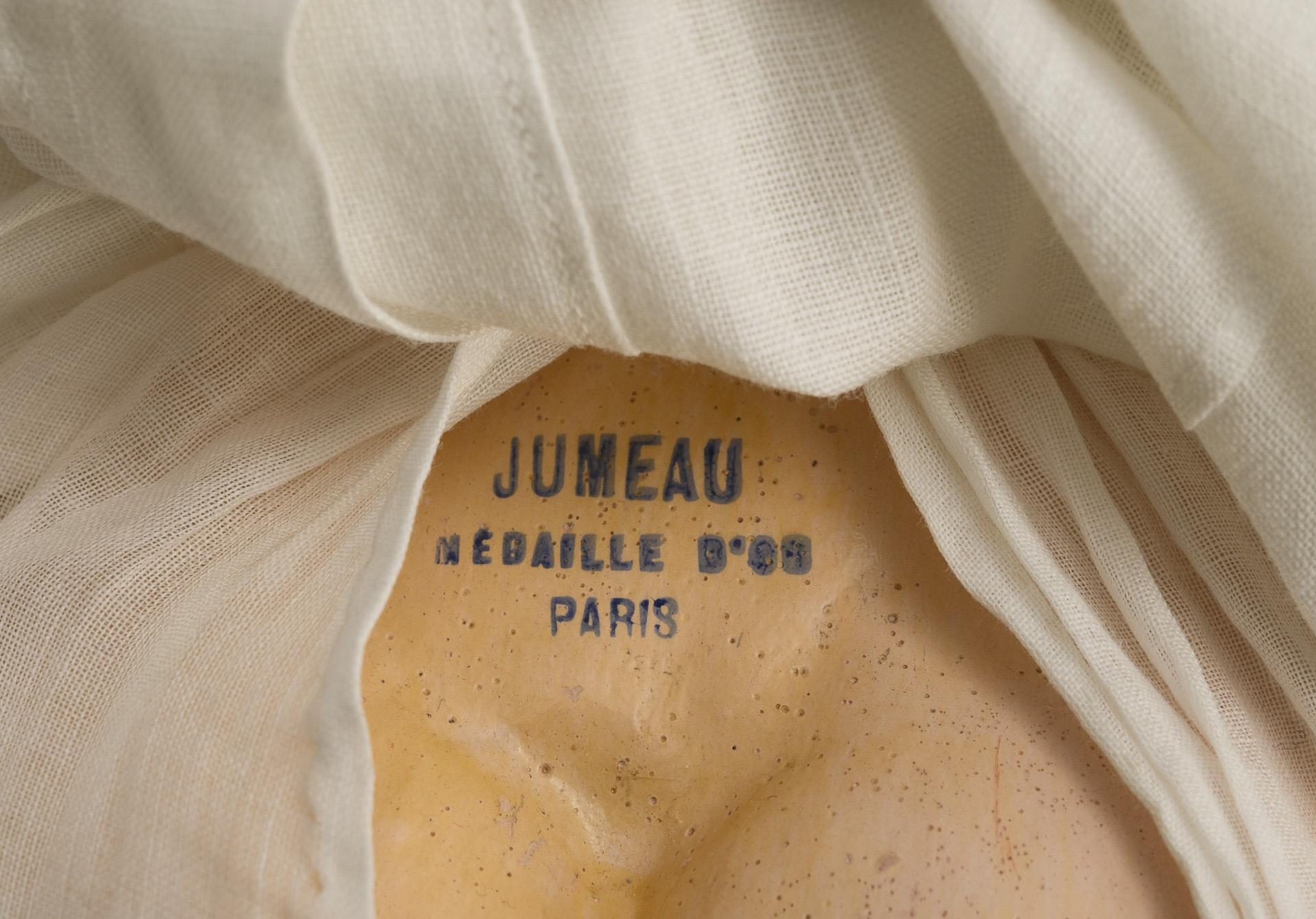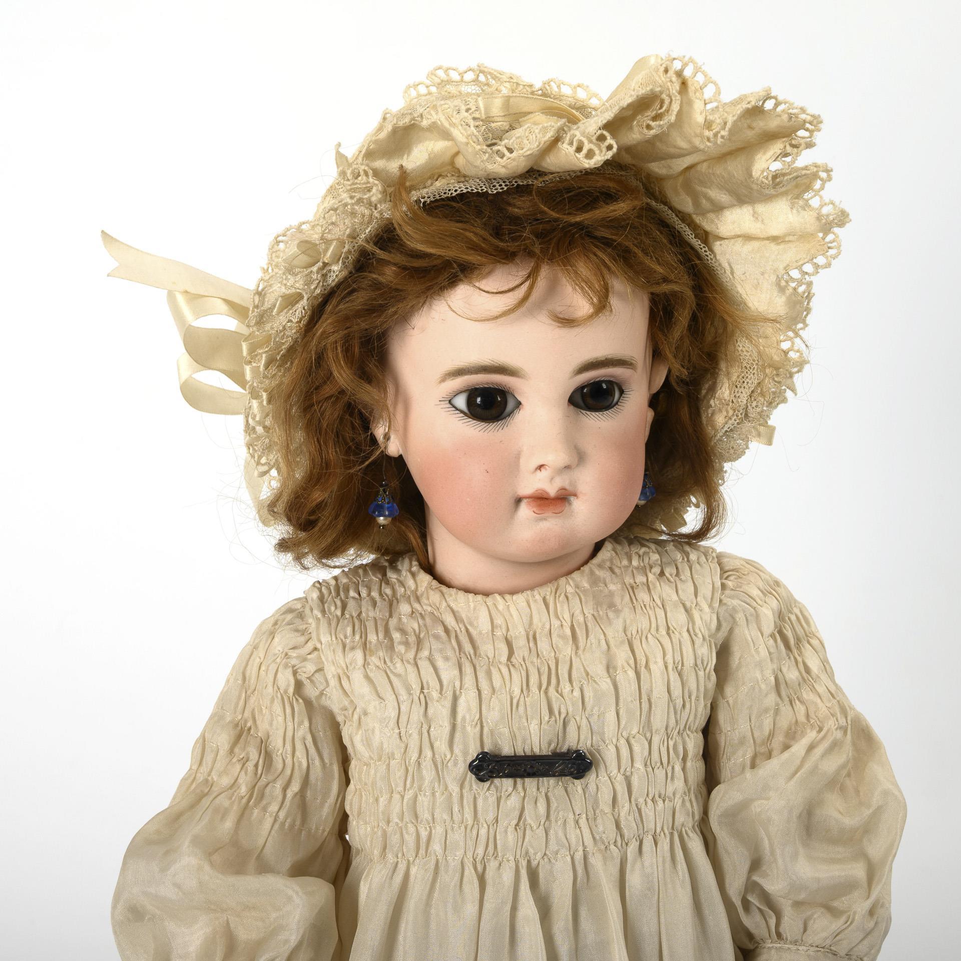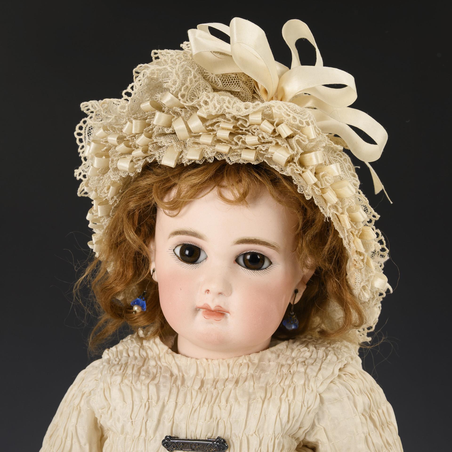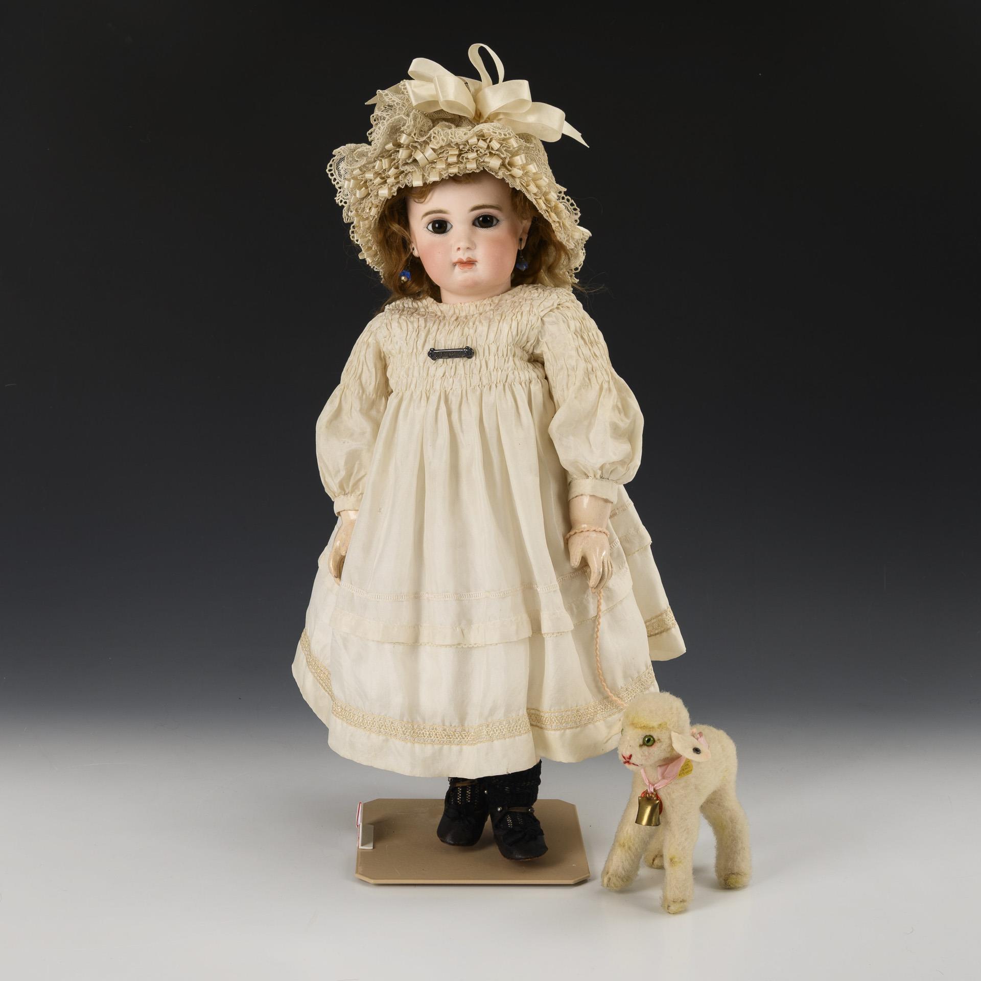 Kurbelkopf, braune Paperweight-Augen, geschlossener Mund, Ohrringe, rotbraune Mohairperücke. 11-teiliger Gliederkörper mit blauem Stempel "Jumeau". Weißes Kleid, Haube, braune Lederschuhe, L 49 cm. Kopf nicht durchleuchtet: keine Risse sichtbar, lediglich minimaler Perückenpull, 1 Chip an der Halskurbel und 1 retuschiertes Ohrläppchen. Dazu kleines Lamm "Lamby", H 15 cm.
