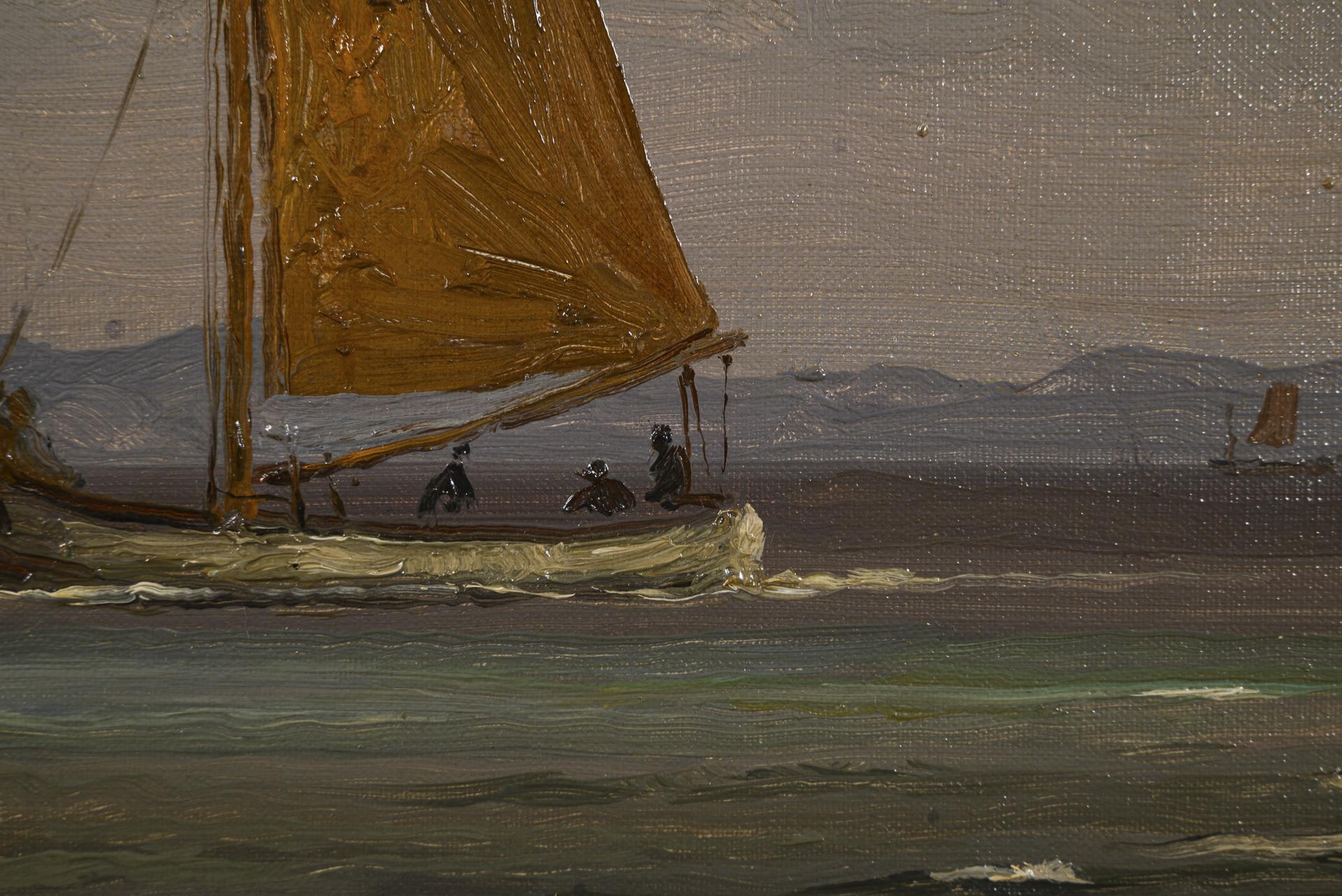 Segler vor dem Strand mit Blick zur schwedischen Küste unter bedecktem Himmel. Minimale Altersspuren.