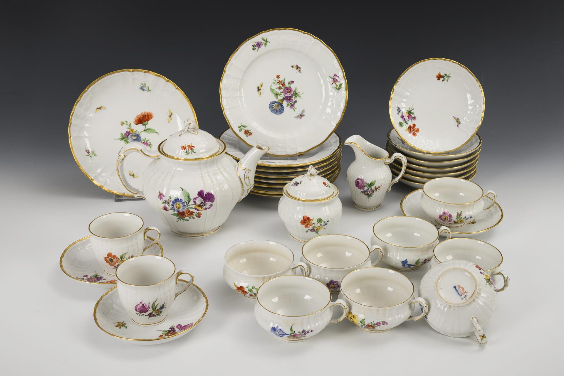 32 Teile. Modell "Antikzierat". Teekanne (H 17 cm), Milchkännchen, Zuckerdose, 8 Teetassen mit 8 Untertassen, 2 Kaffeetassen mit 2 Untertassen, 8 Frühstücksteller und 1 Schale (Ø 20,5 cm). Bestoßung am Stand des Milchkännchens, Deckelrosen bestoßen, partieller Goldabrieb.