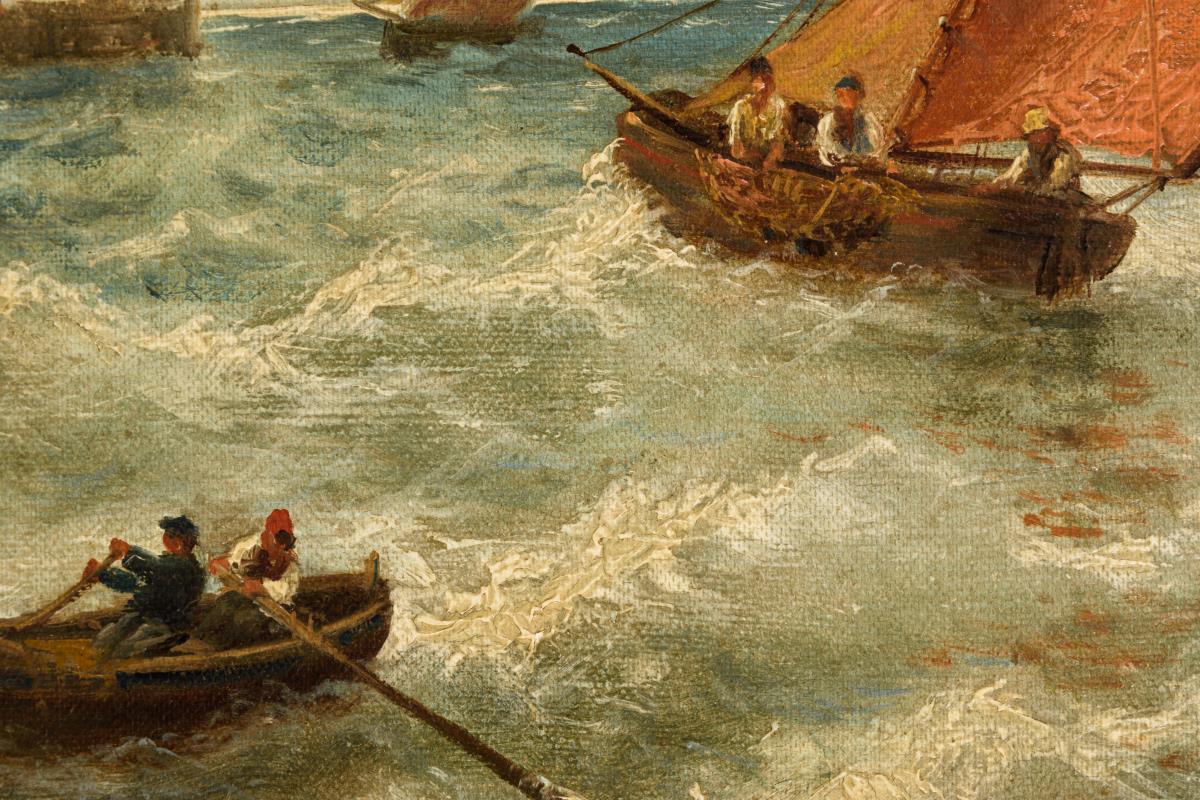 Fischerboote bei starkem Wellengang nahe der Küste mit dem Leuchtturm. Eine restaurierte Stelle mit Hinterklebung.