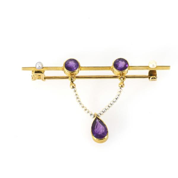 Jugendstilbrosche mit 3 zargengefassten violetten Farbsteinen, wohl Amethysten, einer davon als Anhänger in Tropfenform an einem mit kleinen Perlen aufgezogenen Draht als Abhängung angebracht.