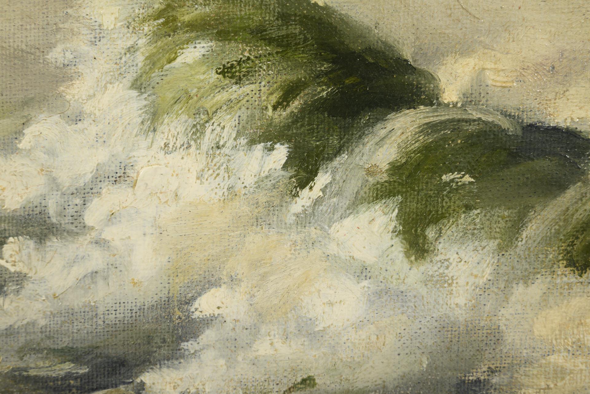 Hohe Wellen nahe dem Strand unter grauem Himmel. Leichte Altersspuren.