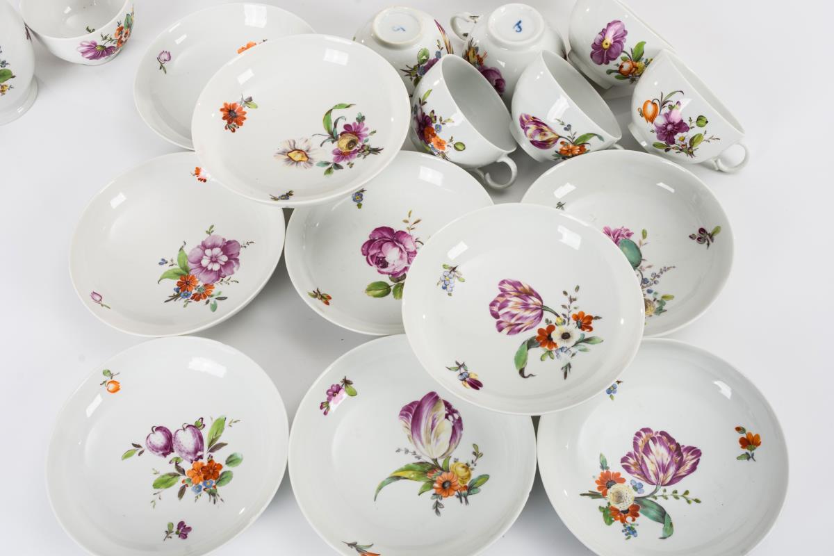 22 Teile. Teekännchen (H 12 cm), Wasserkännchen, Zuckerdose (H 12 cm), 10 Tassen (H 5 cm) und 9 Untertassen (Ø 13 cm). Bestoßung an 2 Untertassenrändern, der Teekannenschneppe, 1 Tassenrand und an den Blütenknäufen, Haarriss in 2 Tassenhenkeln, 1 Tassenhenkel alt repariert.