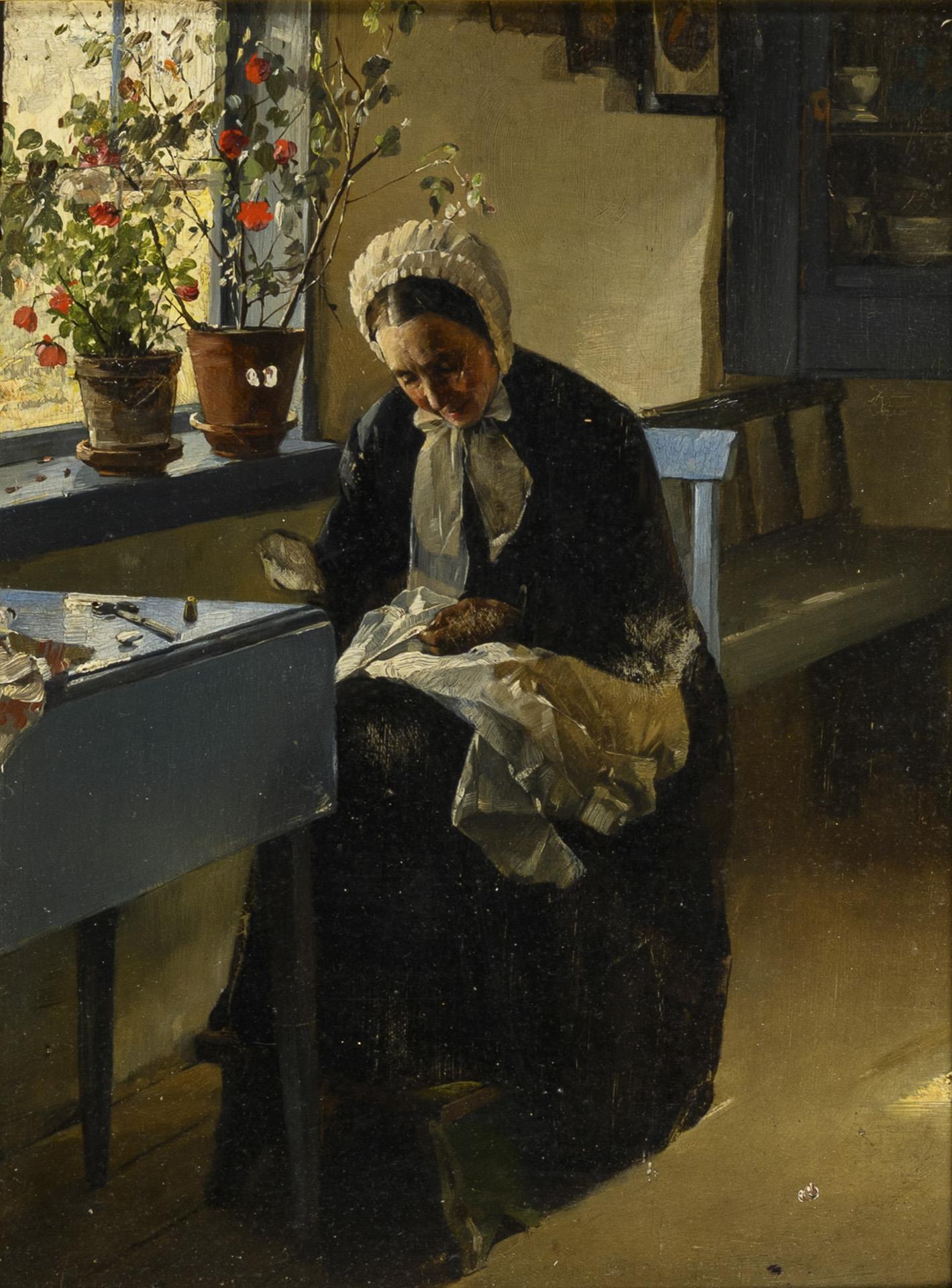 Ältere Frau in der Küche am Fenster beim Nähen eines weißen Hemdes. Eine kleines Loch.