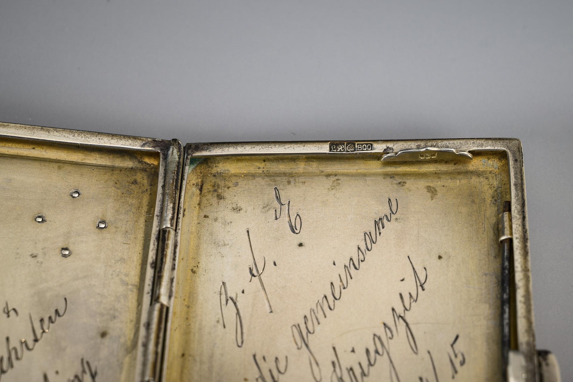 Flaches kleines Etui in massiver Ausführung mit appliziertem Kreuz aus Silber. Innen beidseitig graviert: "W. Scheidt seinem lieben & verehrten Frhr. A. v. Schilling z. f. E. an die gemeinsame Kriegszeit 1914/15". Einige wenige Alters-/Gebrauchsspuren, Gummiband fehlt.