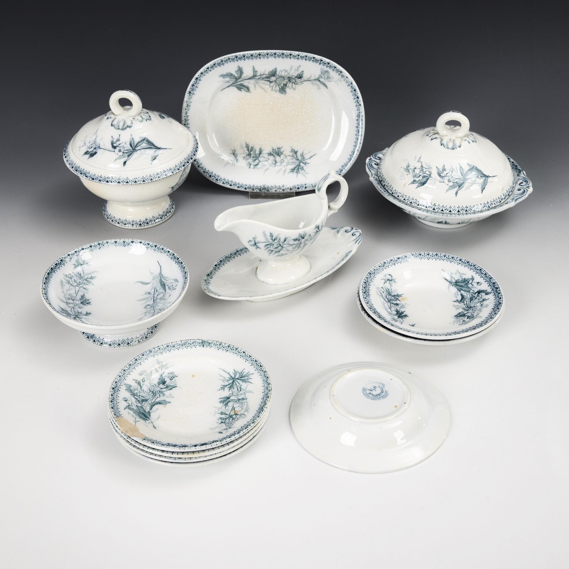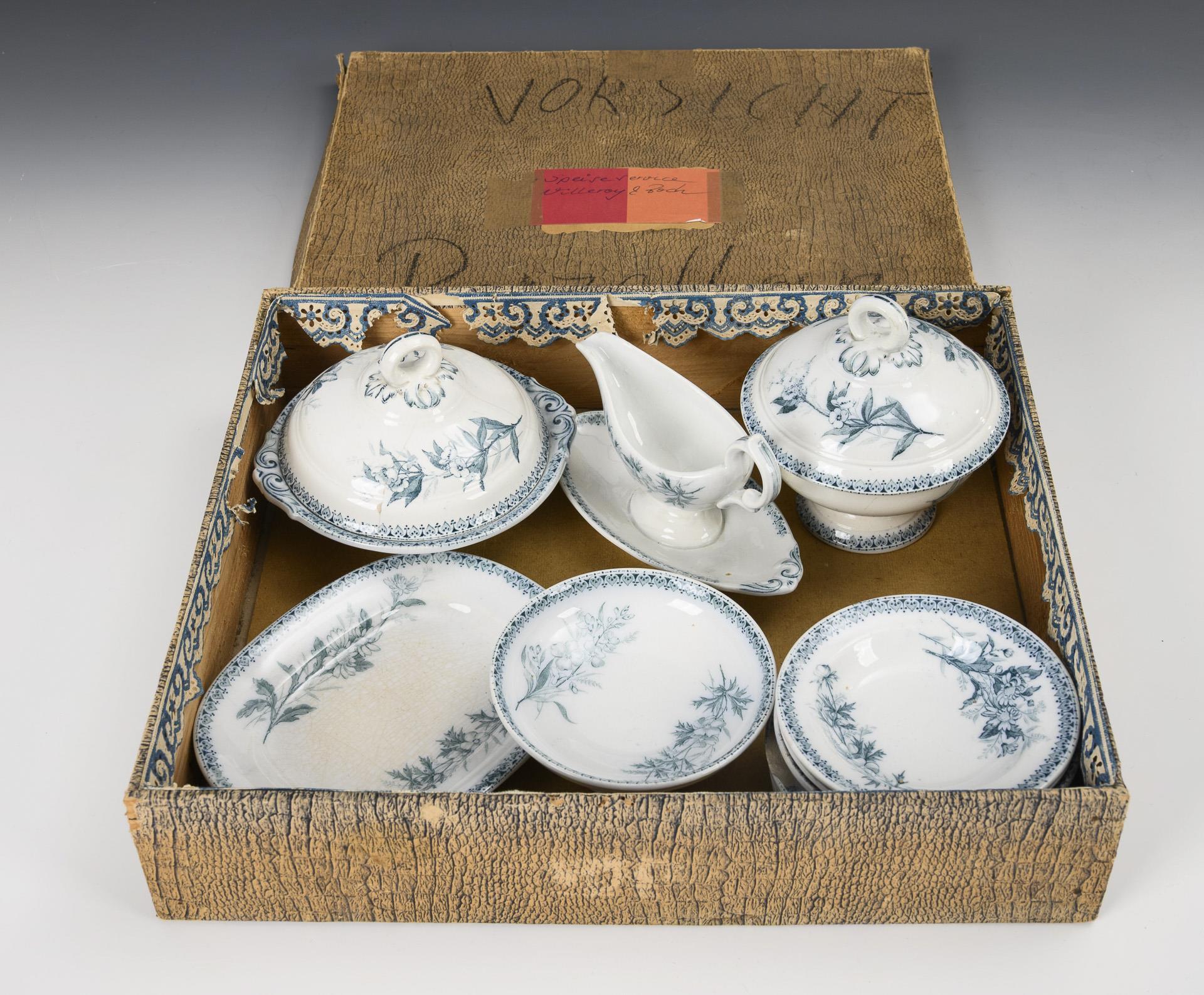 12 Teile. 4 Speiseteller, 3 Suppenteller, 2 Deckelschüsseln, Sauciere, Fußschale und ovale Platte. In altem Karton mit Defekten. Mit Bestoßungen, Haarrissen und Krakelée.