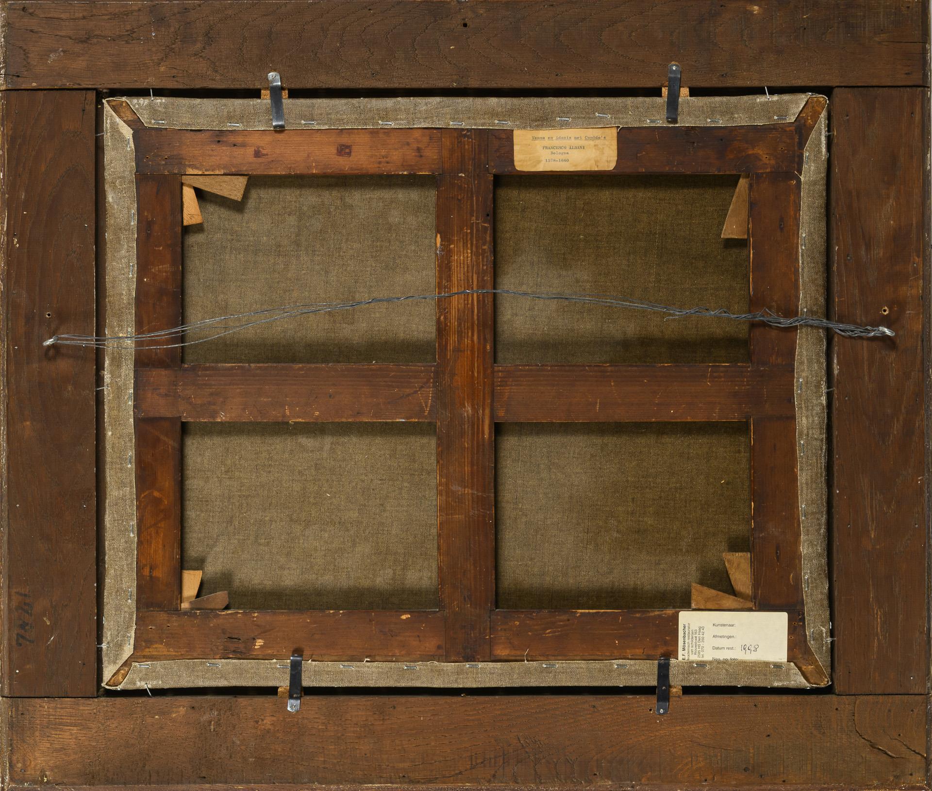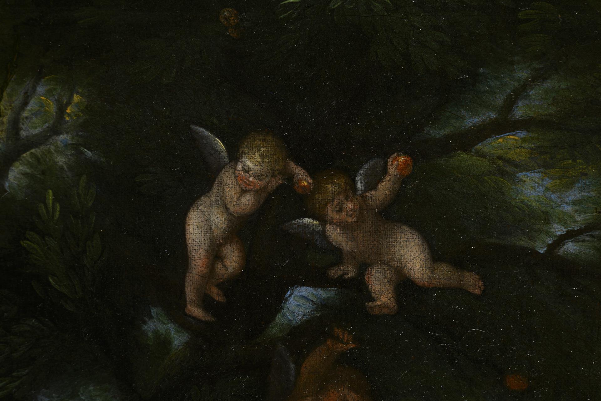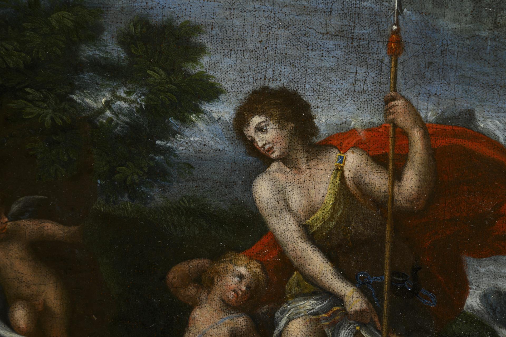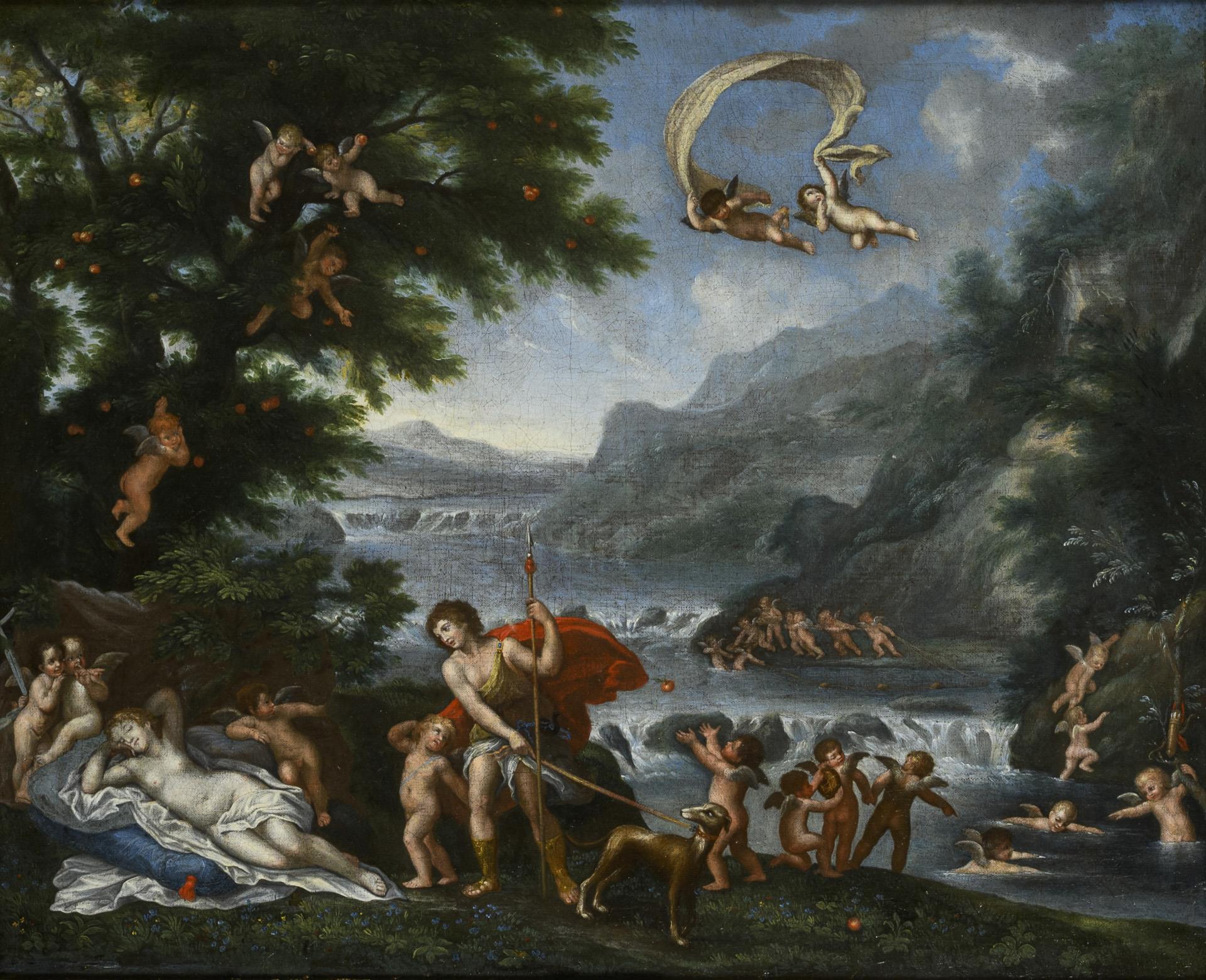 Vielfigurige Szene mit dem jungen Adonis, der auf dem Weg zur Jagd die schlafenden Liebesgöttin in einer wilden Flusslandschaft entdeckt. Leinwand wachsdoubliert.