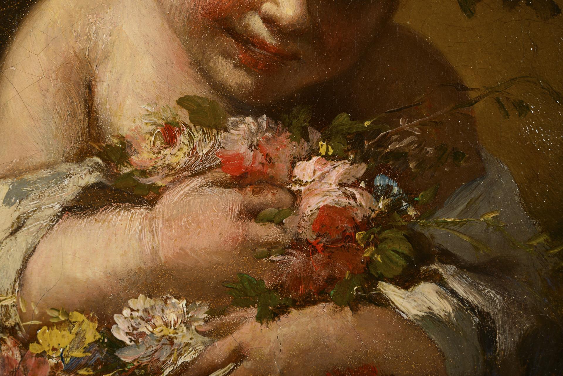 Das Kind beim Sammeln vieler Blumen im weißen Gewand in steiniger Landschaft. Retuschiert.