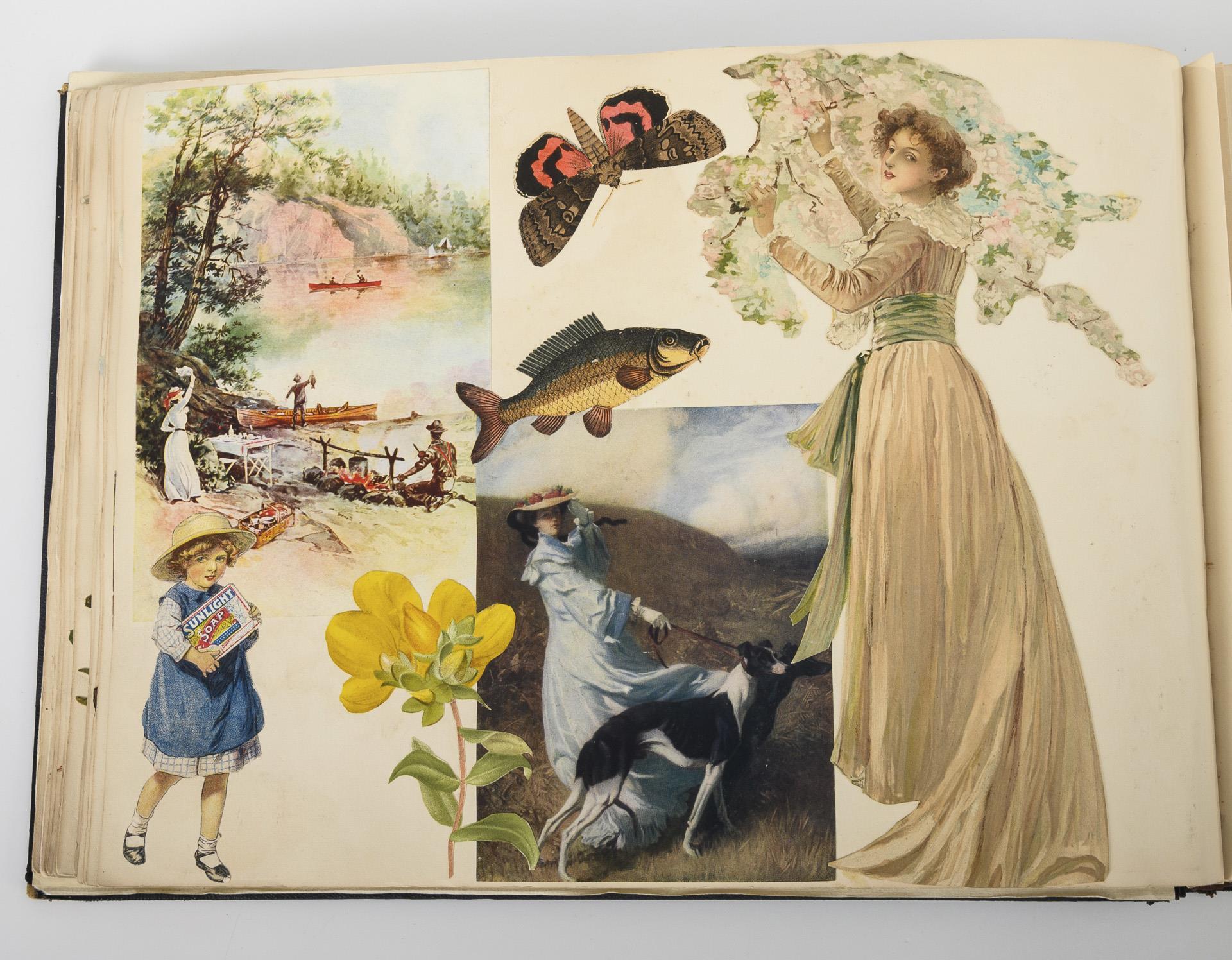 Sammelalbum mit Oblaten bzw. Glanzbildern unterschiedlichster Themen: Tiere, Jagd, Blumen, Genre, Kinder, Damen, Karikatur, Landschaften, Schiffe usw. Teils nach Gemälden, teils englisch beschriftet. Einige wenige Alters-/Gebrauchsspuren.