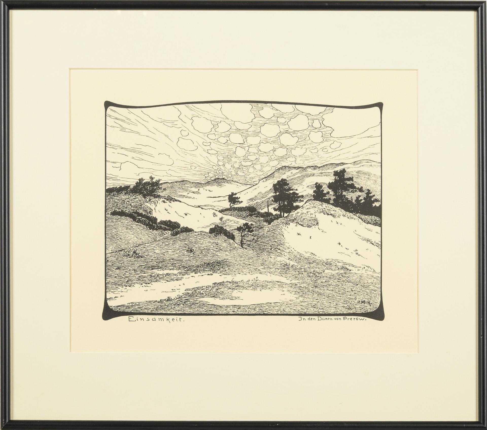 Dünenlandschaft im graphischen Jugendstilrahmen.