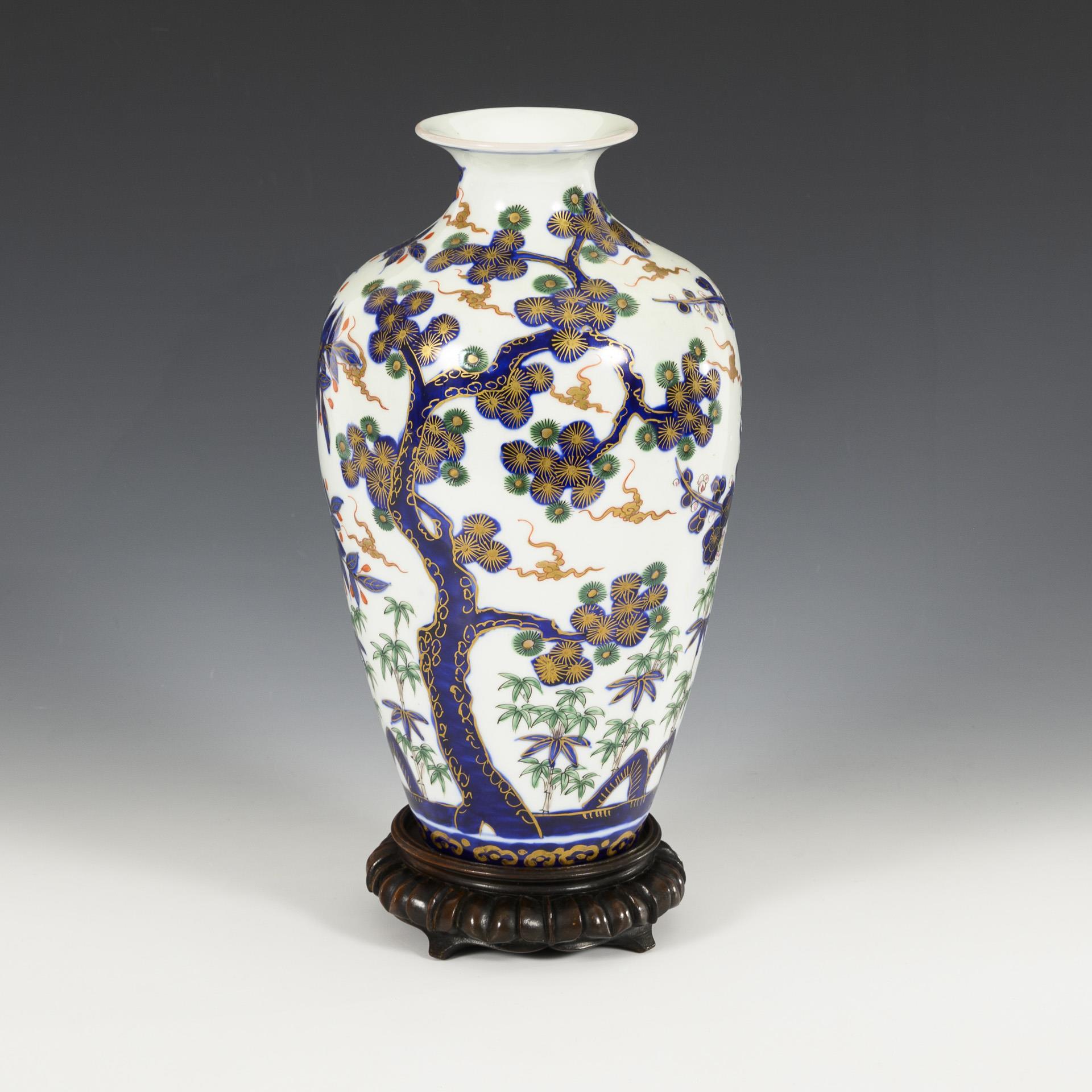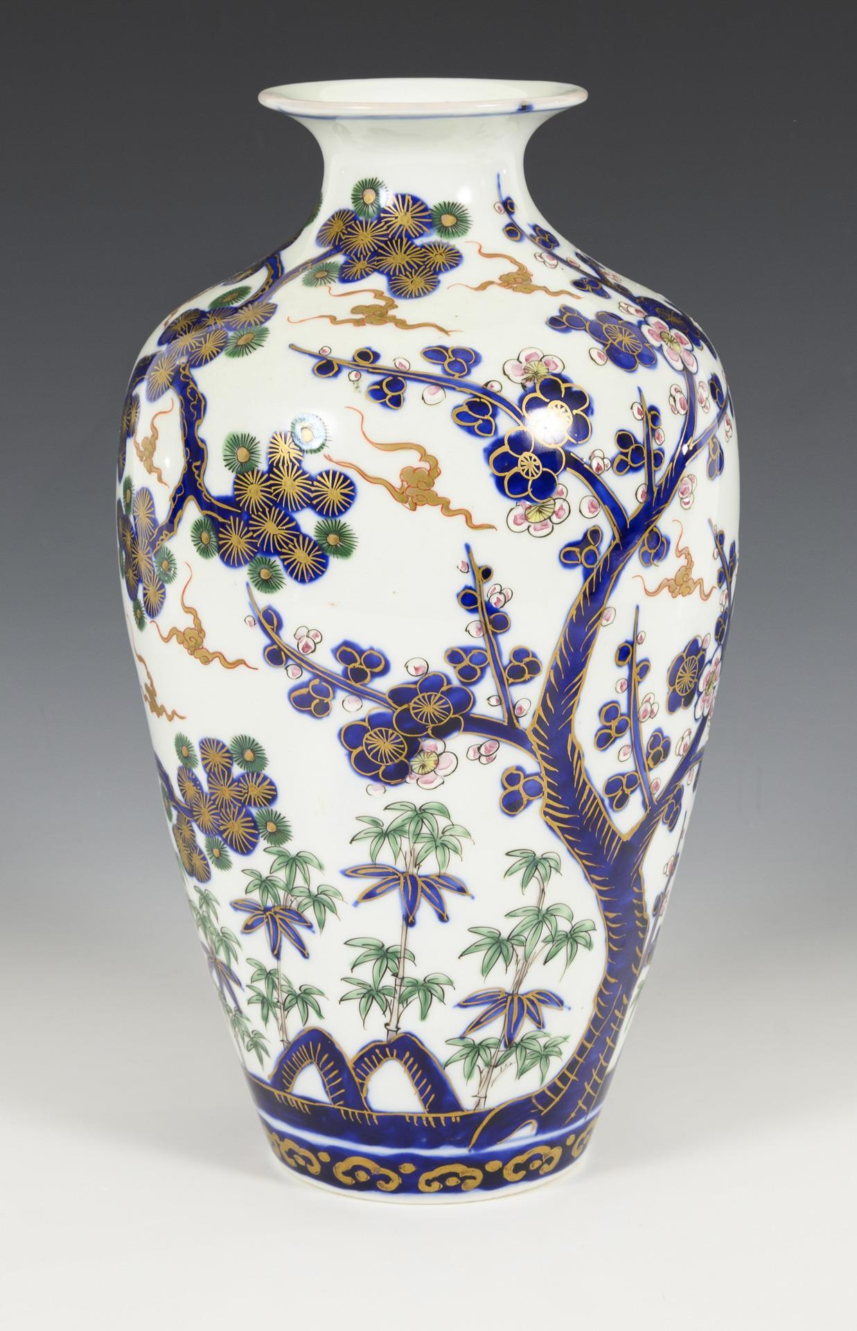 Balustervase mit drei stilisierten Blütenbäumen (Kirsche, Kiefer und ?), unten durch Bambuspflanzen ergänzt. Unterglasur-Blaumalerei, mit Gold, Grün und Rot ergänzt.