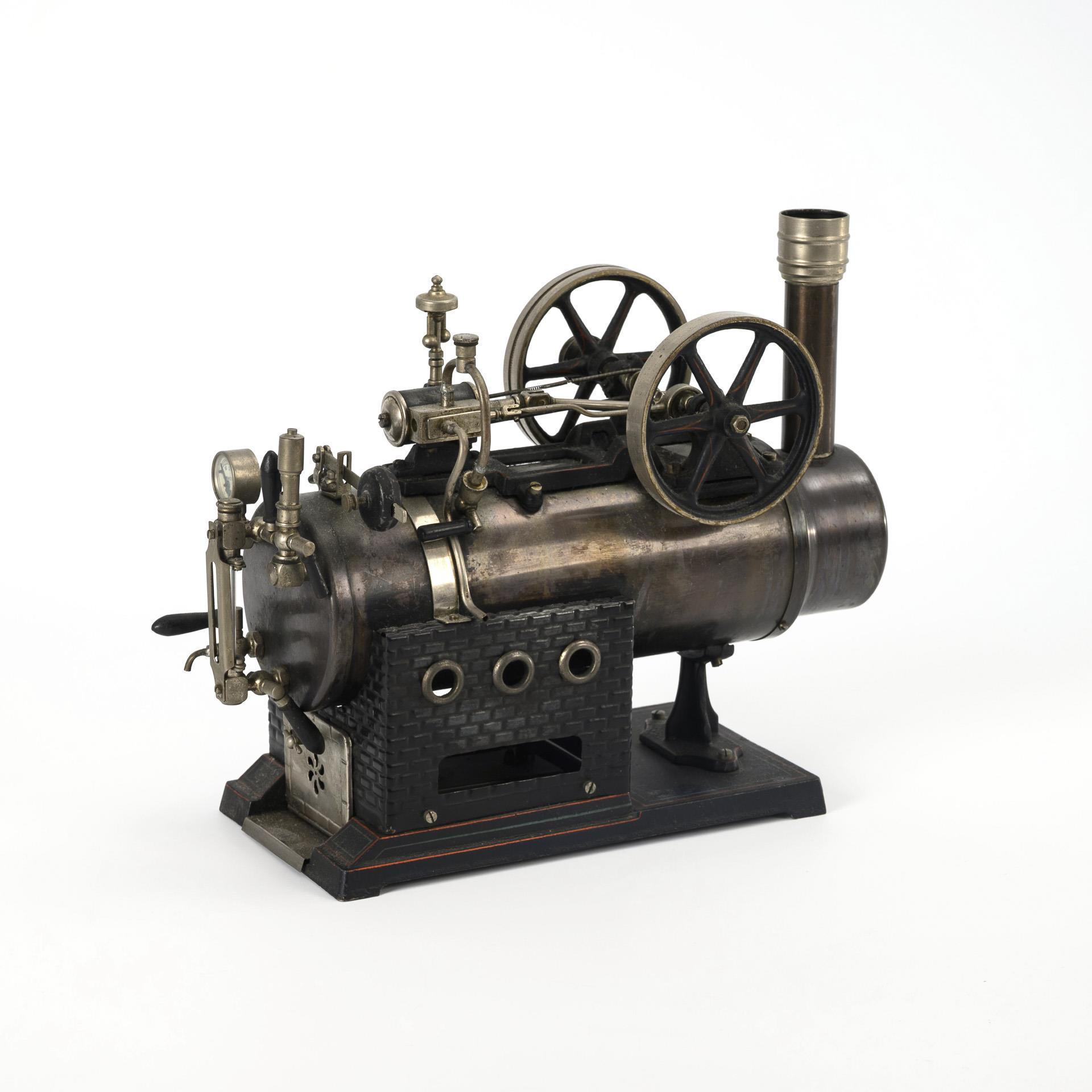 Dampfspielzeug mit liegendem Kessel, feststehendem Zylinder, Manometer und schwarzem Sockel in geprägter Ziegeloptik. Partiell leichte Gebrauchsspuren, Funktion und Vollständigkeit nicht geprüft.