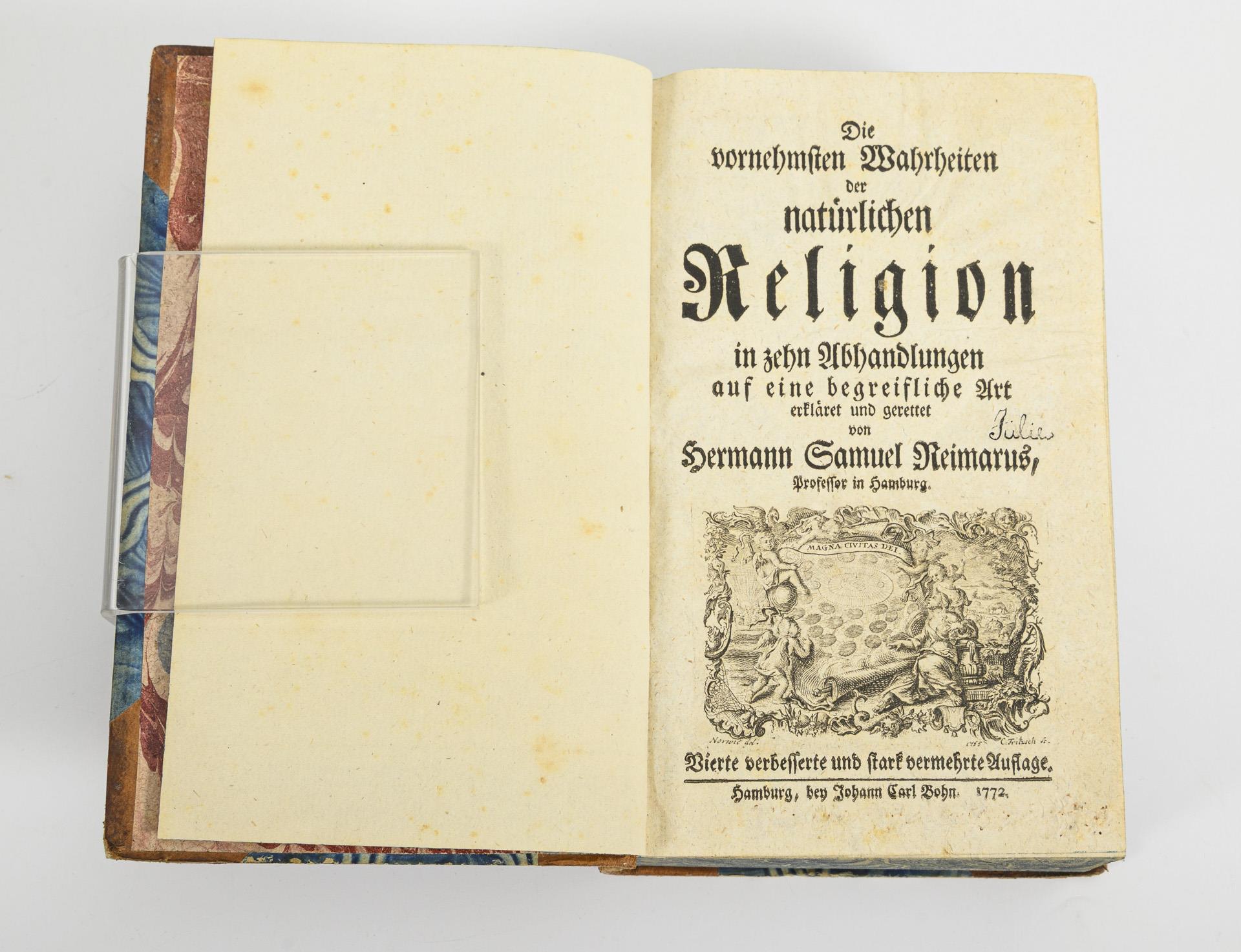 Ewald: "Die Heilige Schrift des Alten Testaments in Hundert Biblischen Kupfern dargestellt", Freiburg in der Herderschen Kunst und Buchhandlung. Im Buchdeckel: "Von der theuren verewigten Mutter geerbt. Sophie Landgräfin zu Hessen Philipsthal Barchfeld", 491 Seiten im Halbledereinband. / "Hermann Samuel Reimarus. "Die vornehmsten Wahrheiten der natürlichen Religion in zehn Abhandlungen ...", Hamburg 1772, bey Johann Carl Boehn. 4. verbesserte und stark vermehrte Auflage. (14), 766, (26) Seiten. Besitzvermerk: "Julie Wilhelmine Pr. zu Sl. Ho. Glücksburg". Im Halbledereinband.