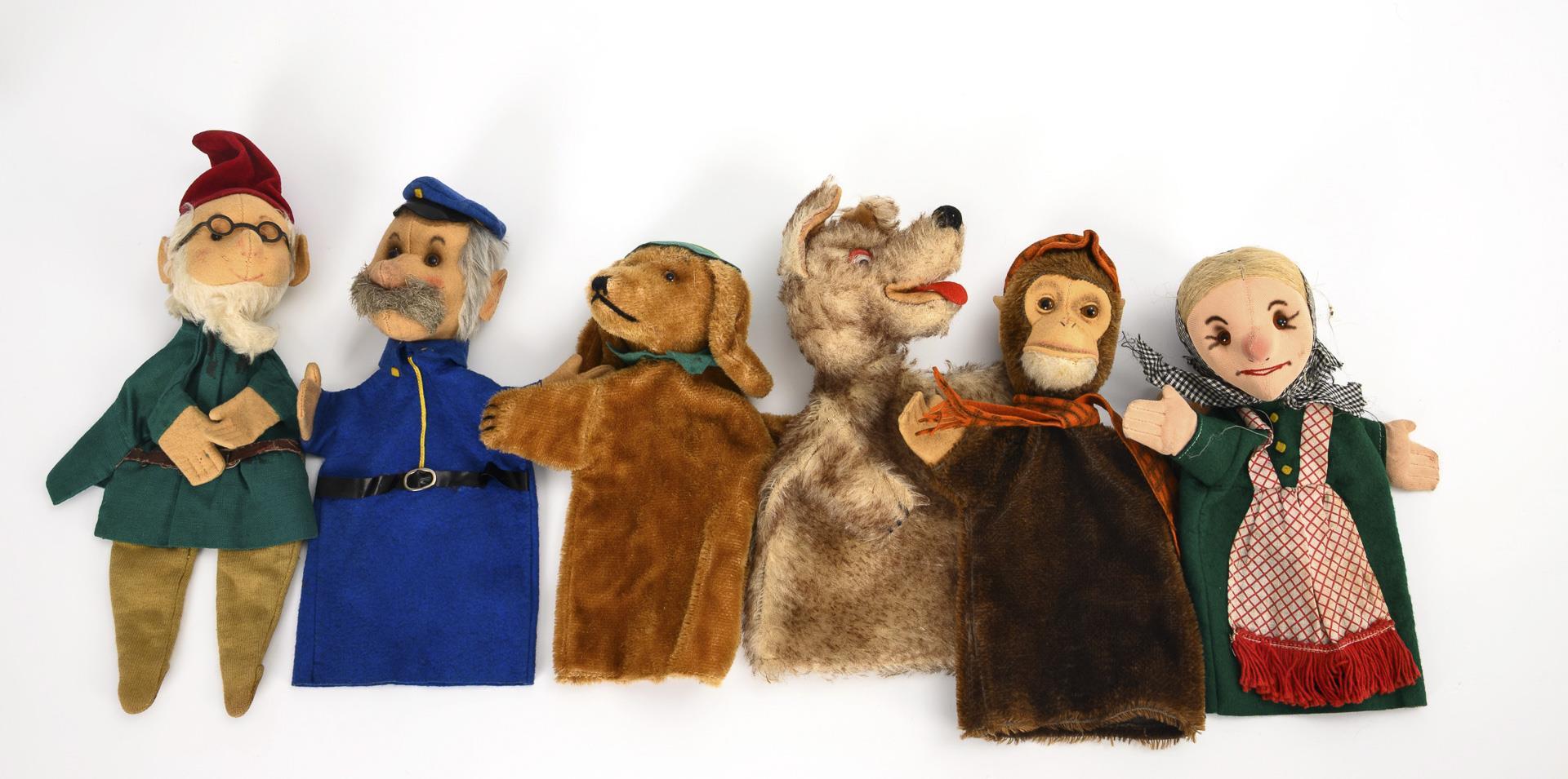 Handfiguren aus der Bibabo-Reihe: Affe als Räuber, Dackel als Jäger, Wolf, Schutzmann (Postbote), Hexe (Typ Großmutter) und Zwerg mit Beinen (ohne Schuhe). Leichte Altersspuren.