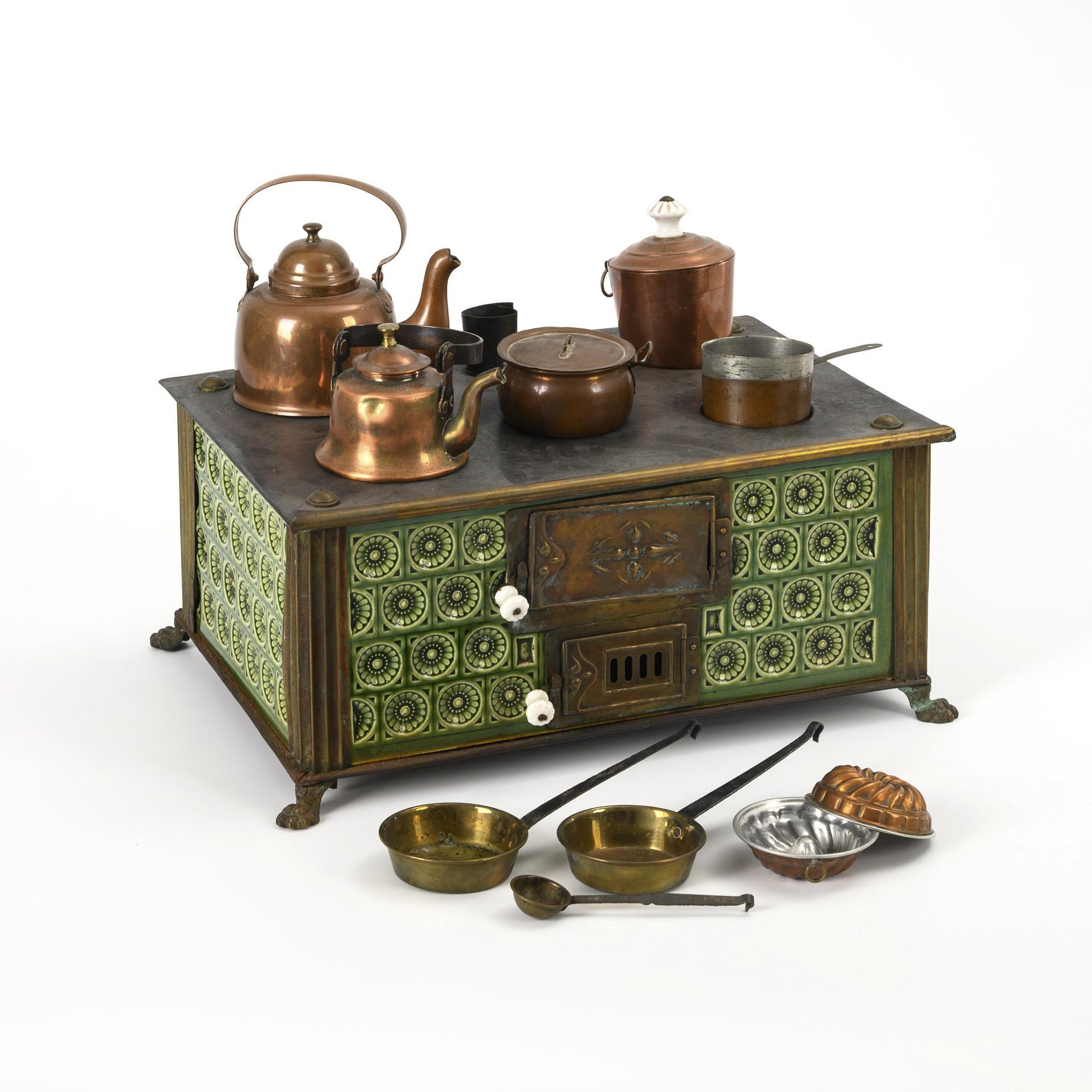 Blechherd mit grünen Keramikkacheln, 5 Kochstellen und 2 Ofenklappen. Dazu altes Kupfergeschirr. Altersspuren, etwas Rost, Schornstein und 3 Messingleisten fehlen.