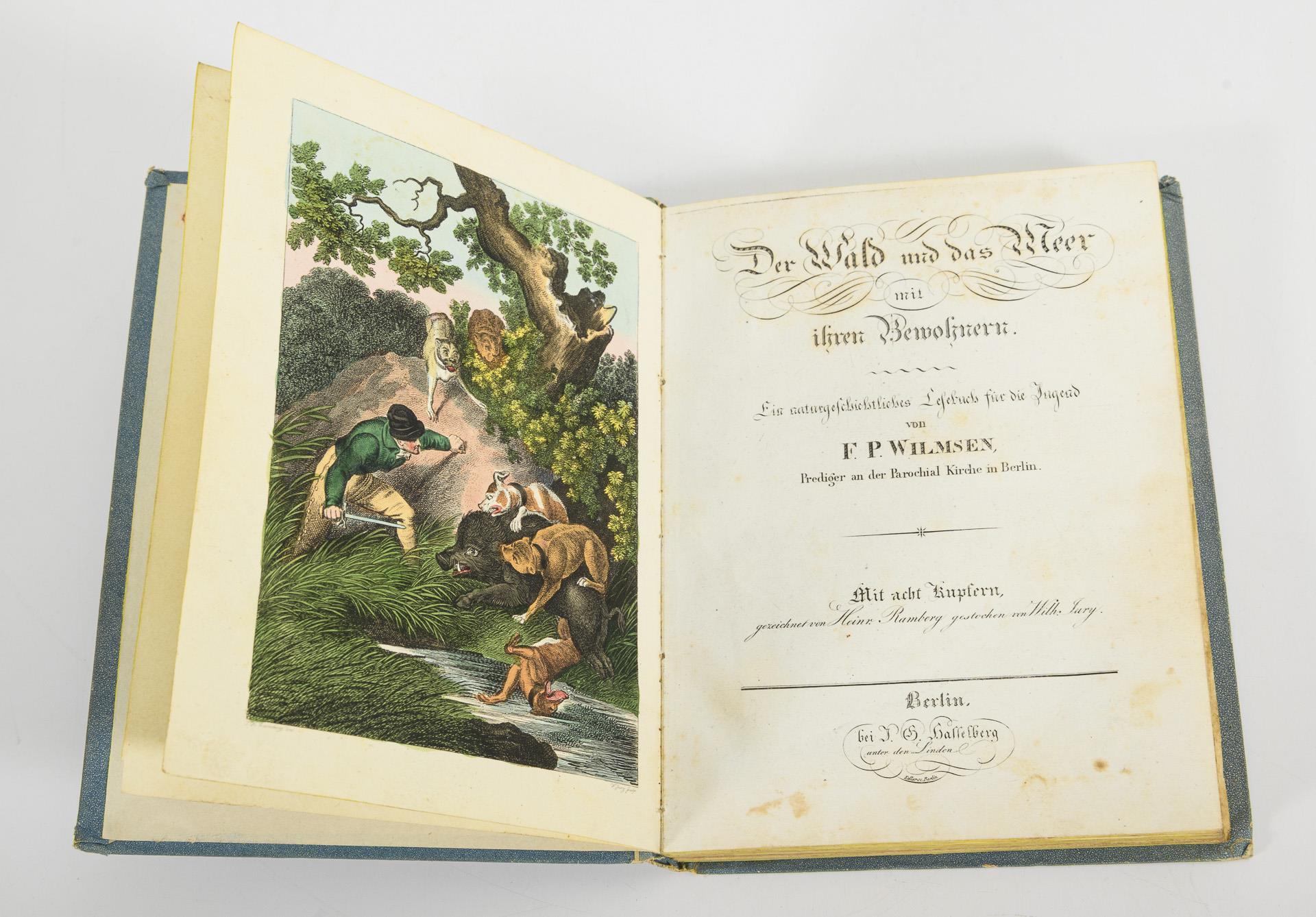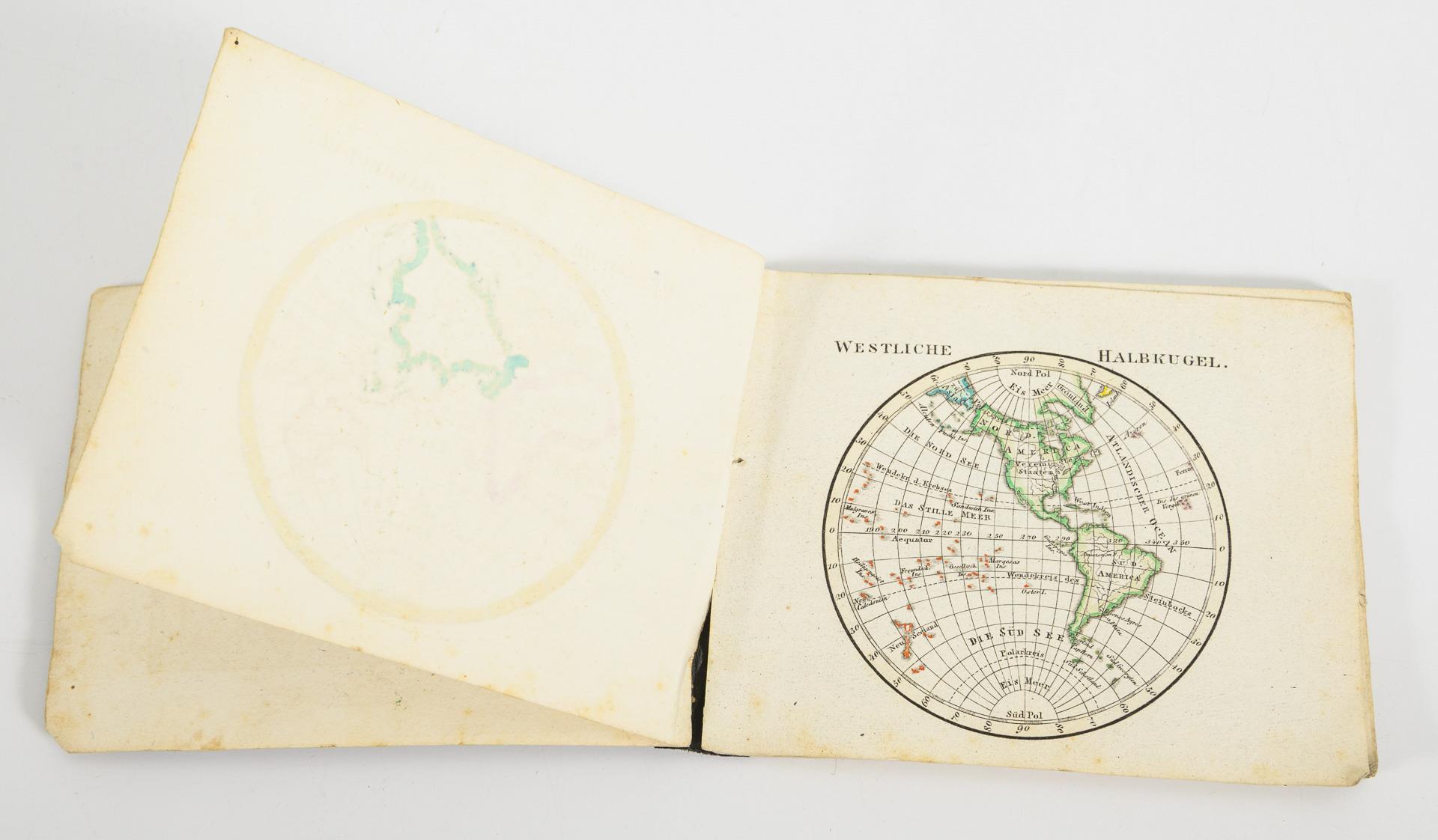 "Taschenatlas über alle Theile der Erde in 24 Karten", Leipzig 1833, bei Schreibers Erben. 10 x 15,5 cm. Hier 23 Karten, grenzkolorierte Kupferstiche, im Heftformat, wohl nachgebunden. / F.P. Wilmsem: "Der Wald und das Meer mit ihren Bewohnern", ein naturgeschichtliches Lesebuch für die Jugend. Berlin, ohne Jahr, bei J.G. Hasselberg. 184 Seiten mit 8 sehr schön kolorierten, ganzseitigen Kupfern. Im Pappeinband.