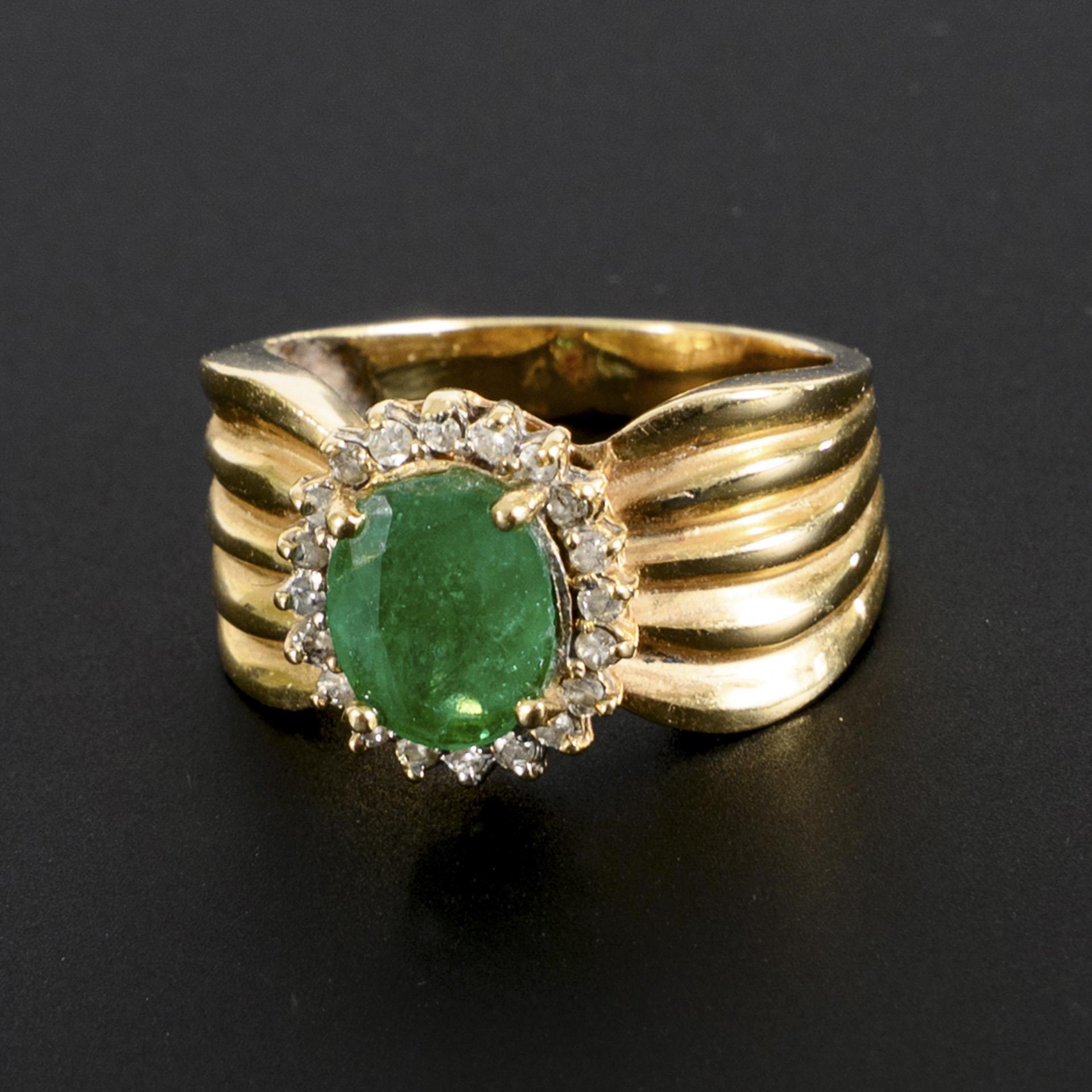 Sie befinden sich hier: Startseite Kategorien Schmuck Außergewöhnlicher Entourage-Ring mit großem grünen Farbstein, wohl Smaragd