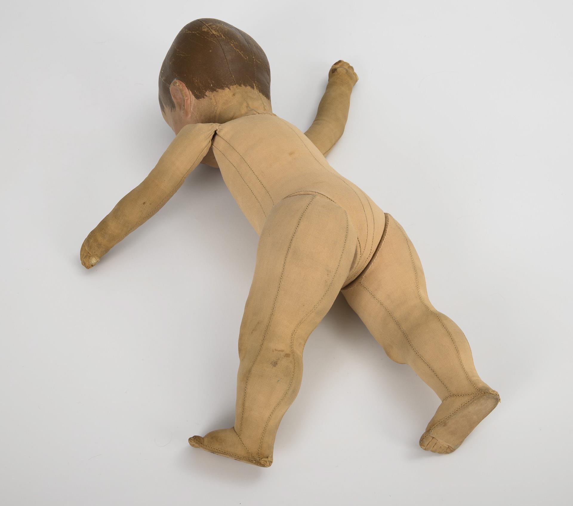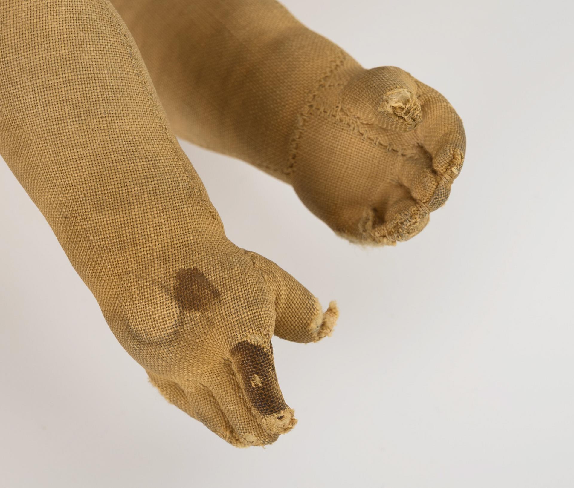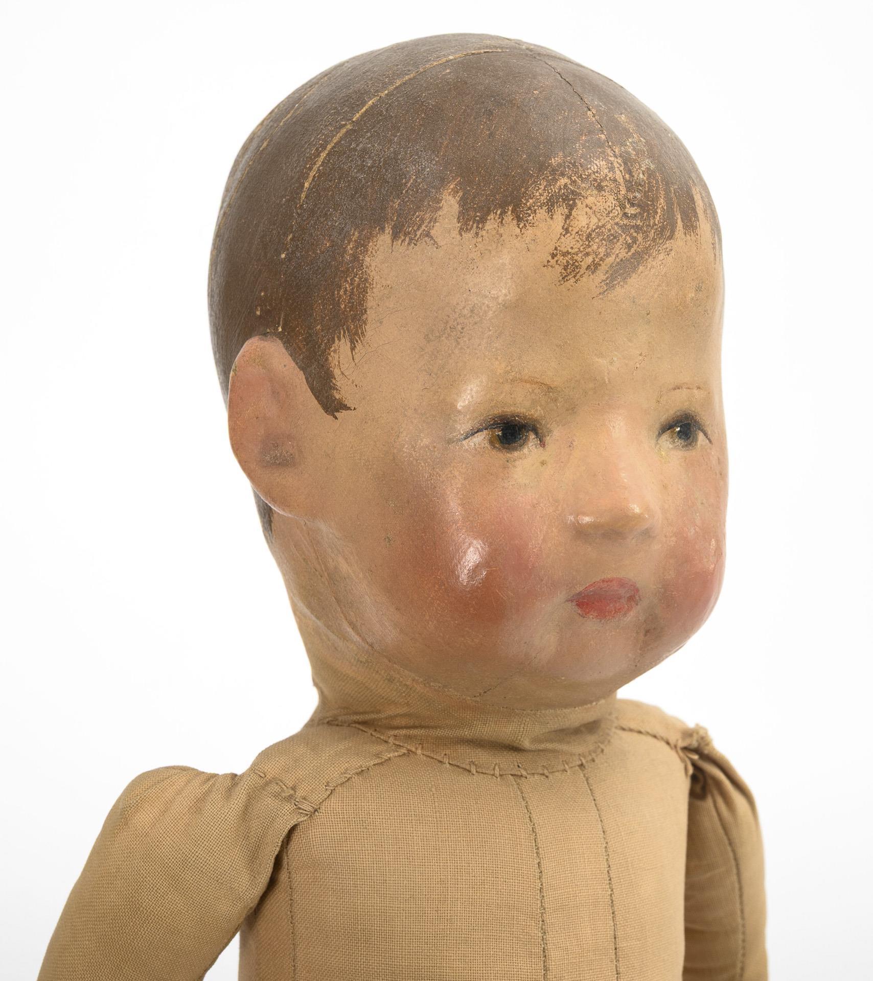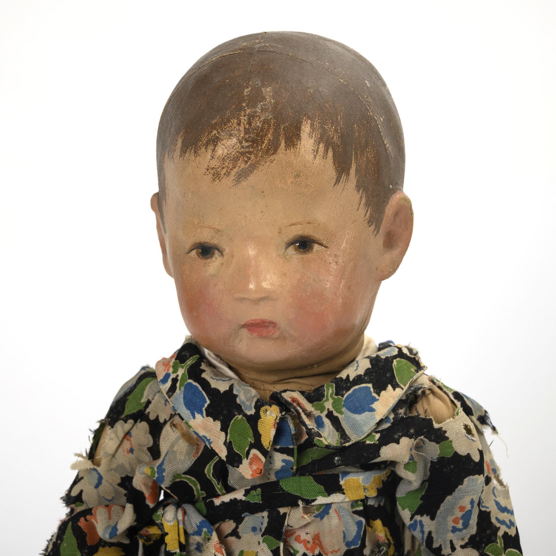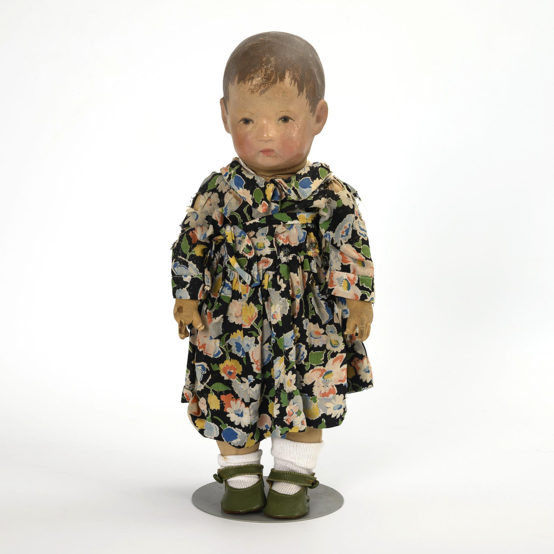 Maskenartig bemalter Kopf mit 3 Hinterkopfnähten, Körper mit breiten Hüften. Geblümtes Kleid mit Defekten, grüne Schuhe. Gesicht partiell übermalt. Altersspuren, Hände fleckig, mit kleinen Defekten.
