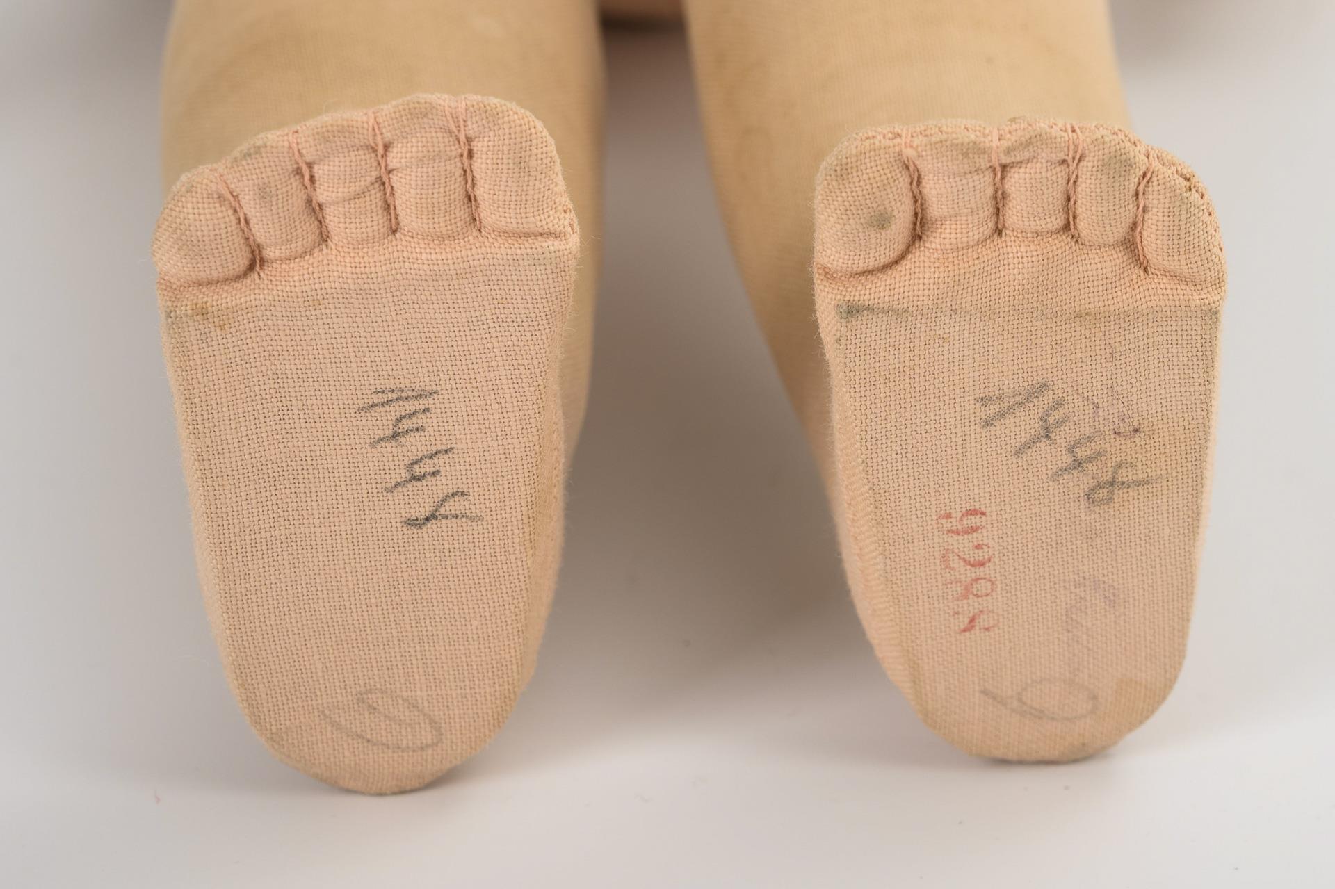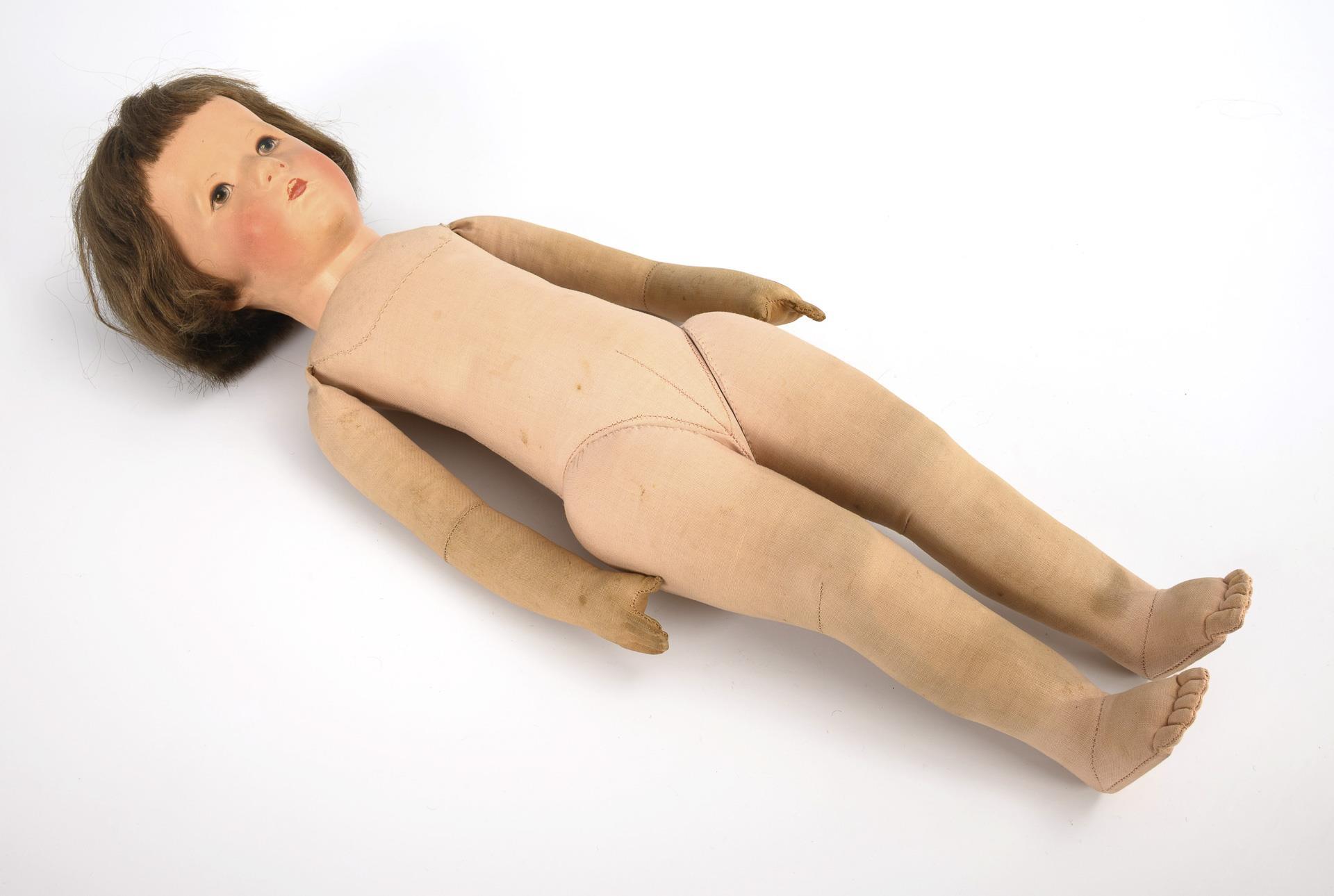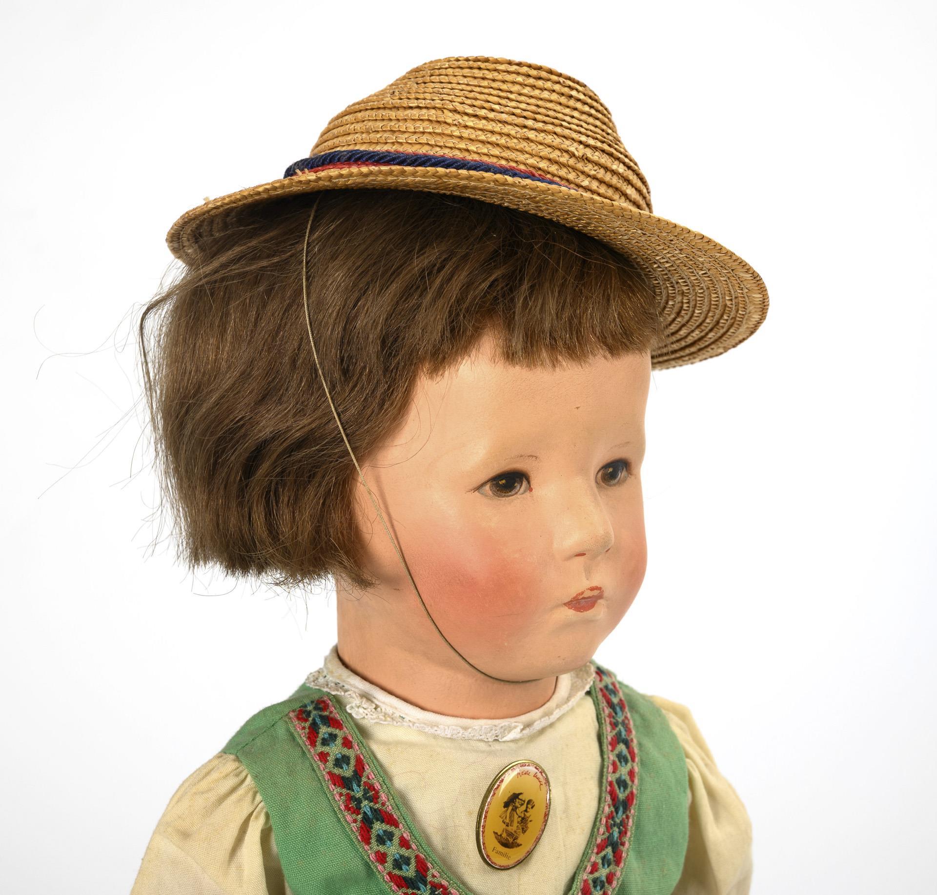 Typ VIII. Mit Stoff bespannter Kurbelkopf, gemalte braune Augen, abnehmbare hellbraune Echthaarperücke mit Bubikopf. Stoffkörper mit Schlenkerarmen, Beine mit Scheibengelenken. Grünes Dirndl, rosa Schürze, Strohhut, blaue Lederschuhe. Gesicht und Lippen minimal berieben, Körper etwas verschmutzt.