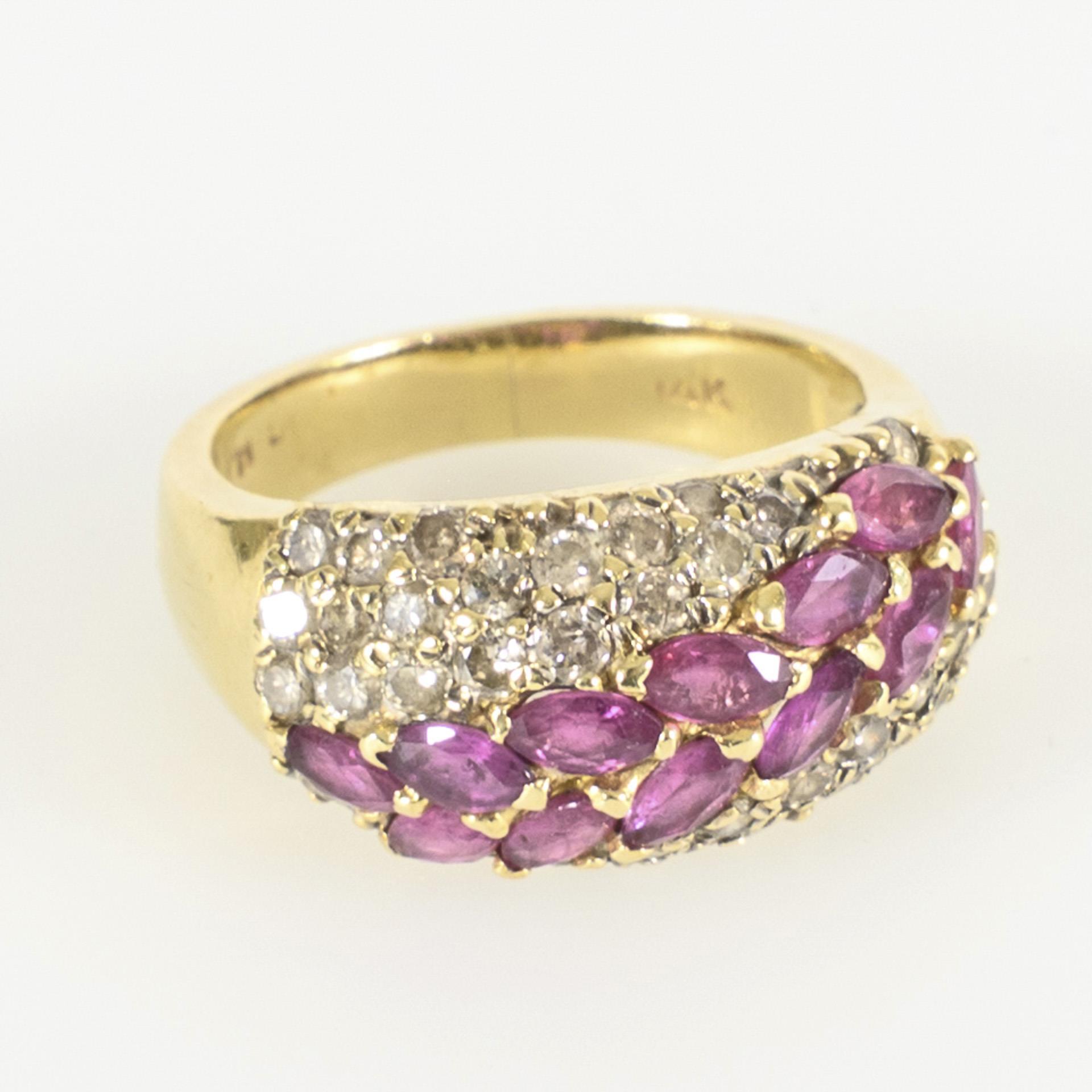 Breiter Ring mit Besatz aus pavégefassten Brillanten, dazwischen ein Schrägband aus navetteförmigen, rosa-violetten Rubinen. Unterseitig leichte Tragespuren.