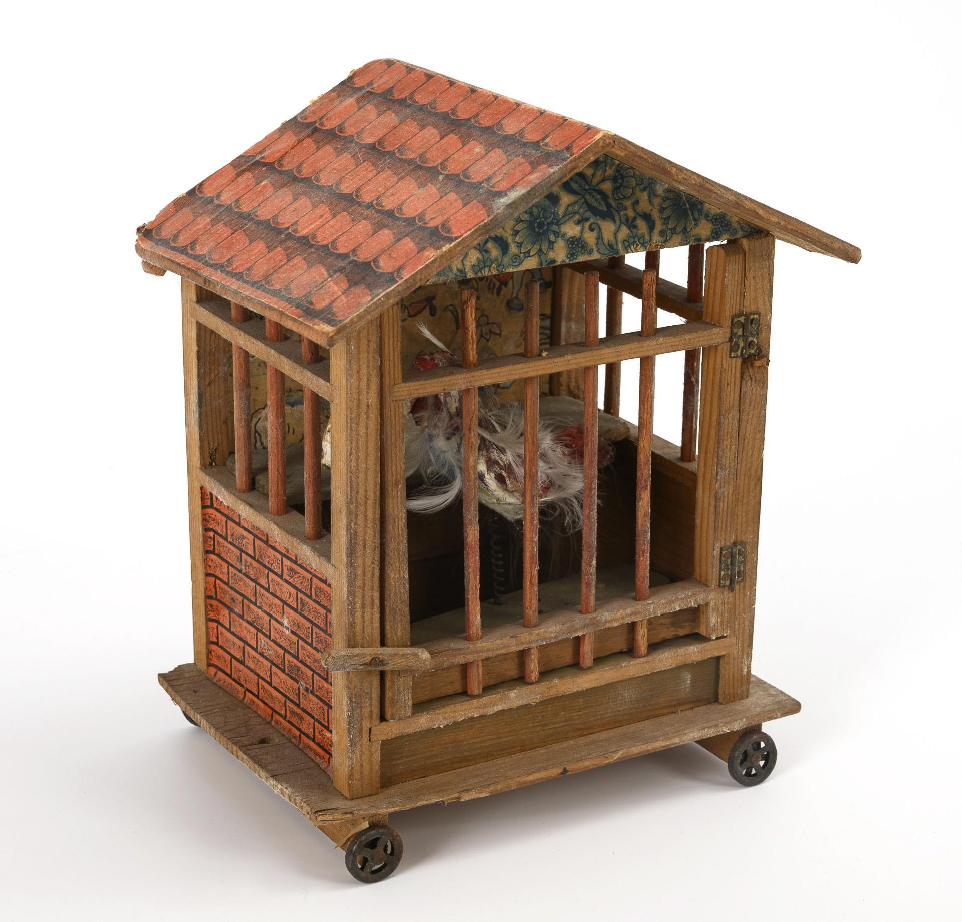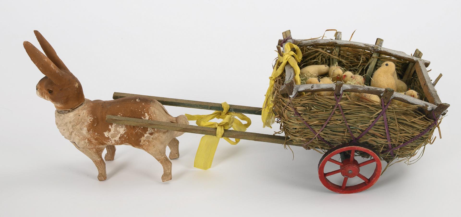 Kleines Hühnerhaus auf Rädern, beim Öffnen der Tür kommt der Hahn herausgeschnellt (22 x 17 x 12 cm). Karre mit gelben Watte-Küken (13,5 x 37 x 14,5 cm). Papp-Hase als Candybox (H 17,5 cm). 4x Masse-Geflügel und verschiedene, auf Pappe geheftete Celluloid-Vögel. Altersspuren, kleine Defekte.