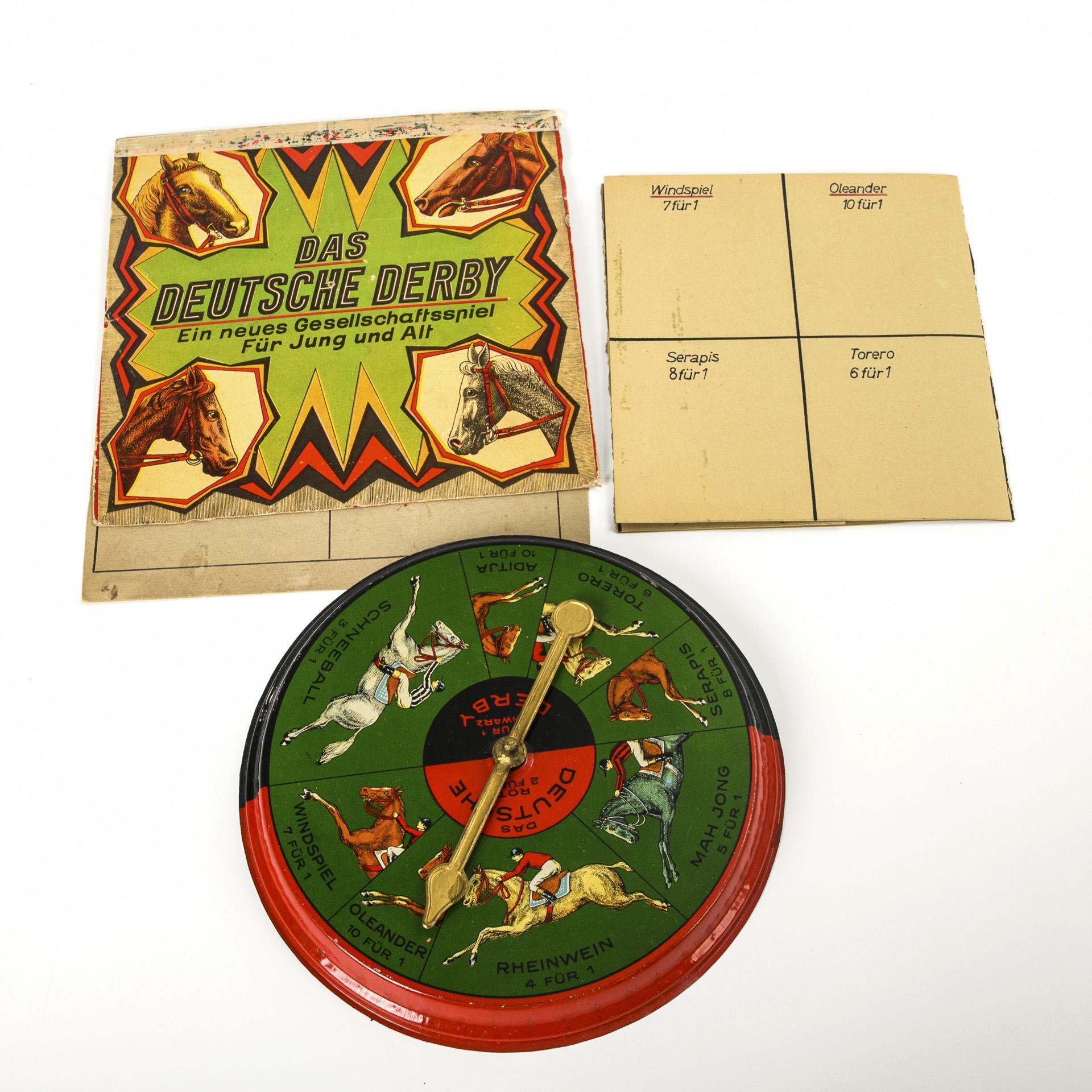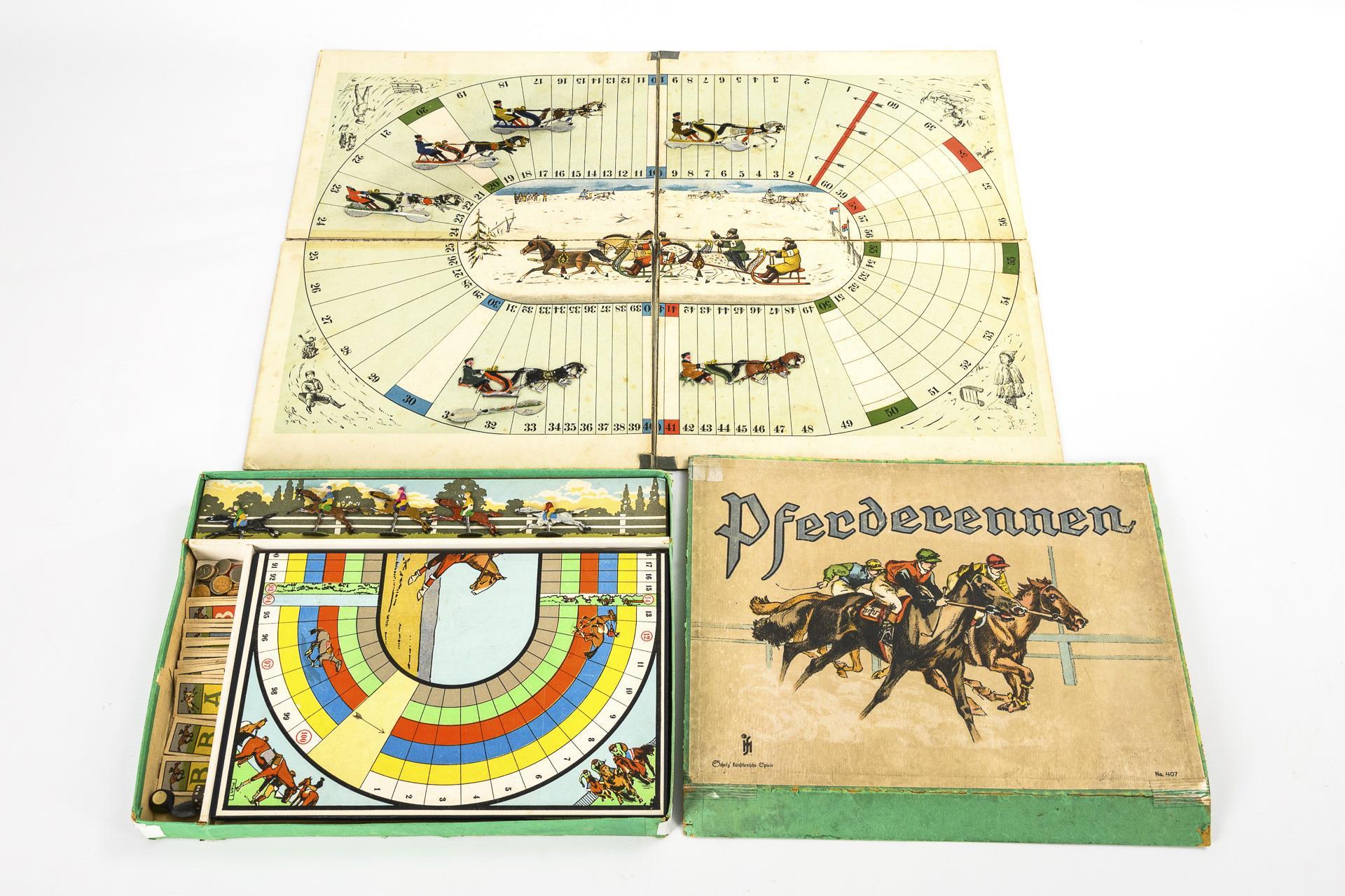 "Das Deutsche Derby". Spiel mit Drehzeiger aus Blech, Deckelbild und teils ergänztem Spielplan. / "Pferderennen No. 407, Scholz' künstlerische Spiele", mit 2-seitigem Spielplan und bemalten Zinnfiguren. Im Originalkarton mit Spielanleitung im Deckel. / In diesem Kasten weiteres russisches Pferderennspiel mit ausklappbarem Rennfeld und bemalten Zinnfiguren. Vollständigkeit nicht geprüft, teils mit Defekten.