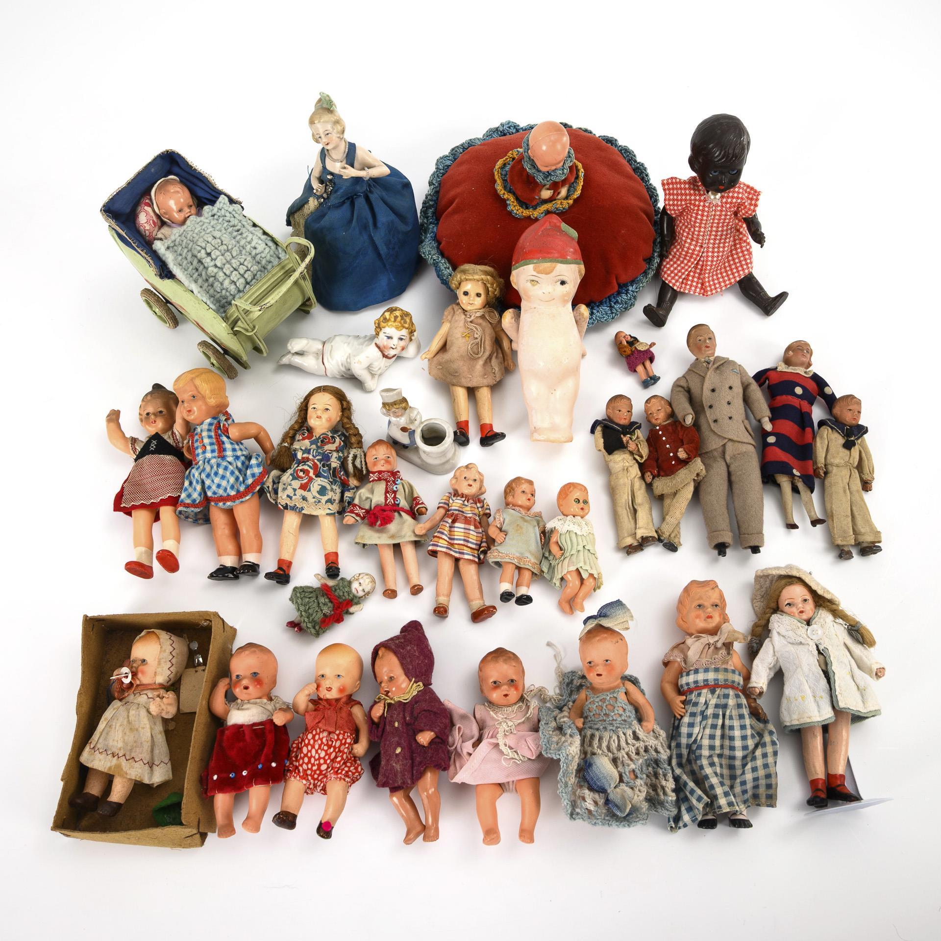 Ca. 30 Püppchen, darunter auch 1 Nadelkissen und 1 Kinderwagen aus hellgrün lackiertem Blech (13 x 17 x 7,5 cm). Bespielt, mit Altersspuren und Defekten.