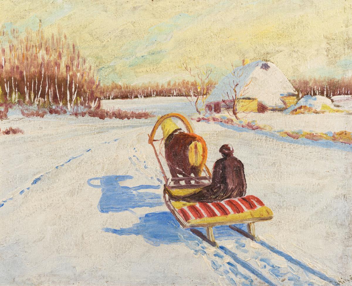 Russischer Maler: Schlittenfahrer in verschneiter Landschaft