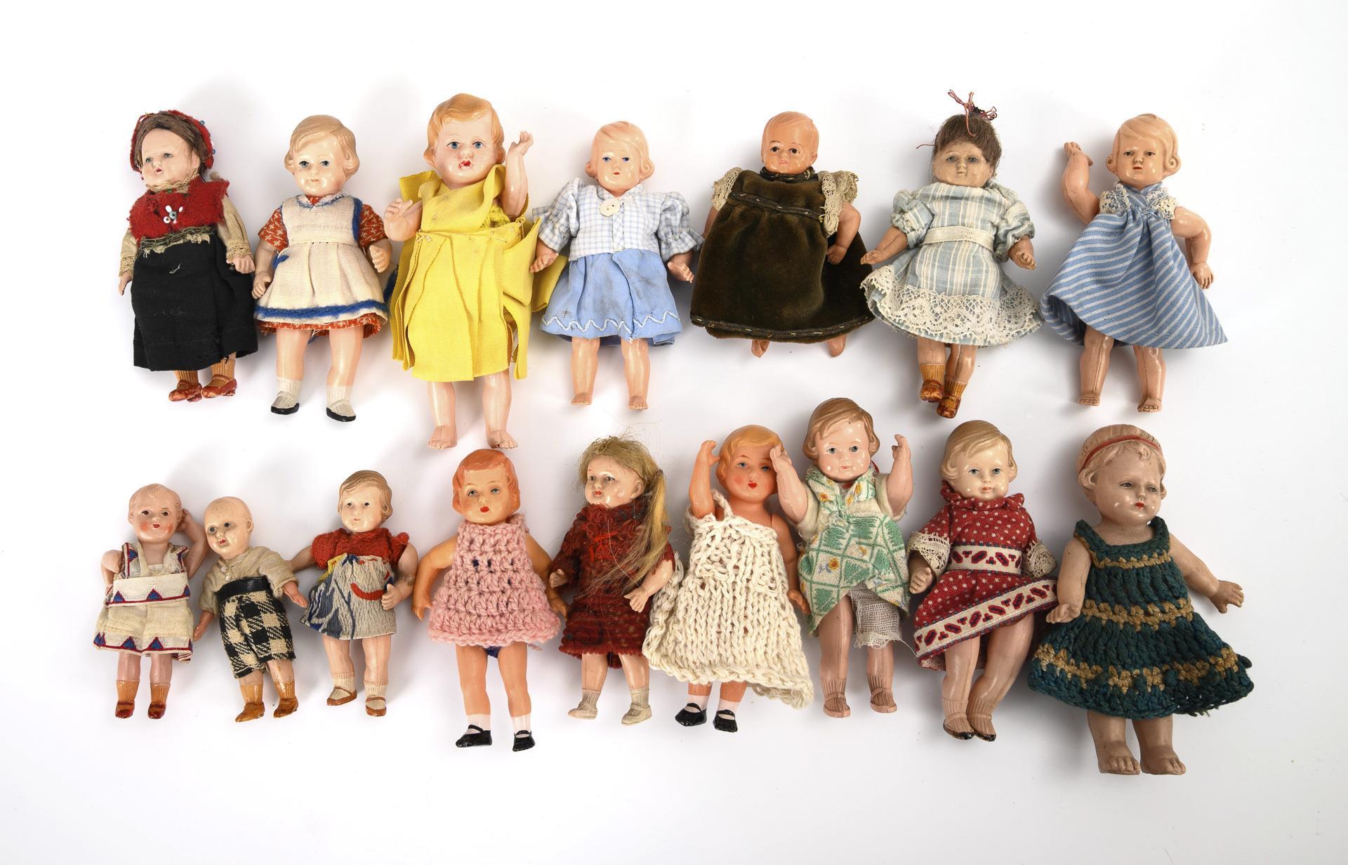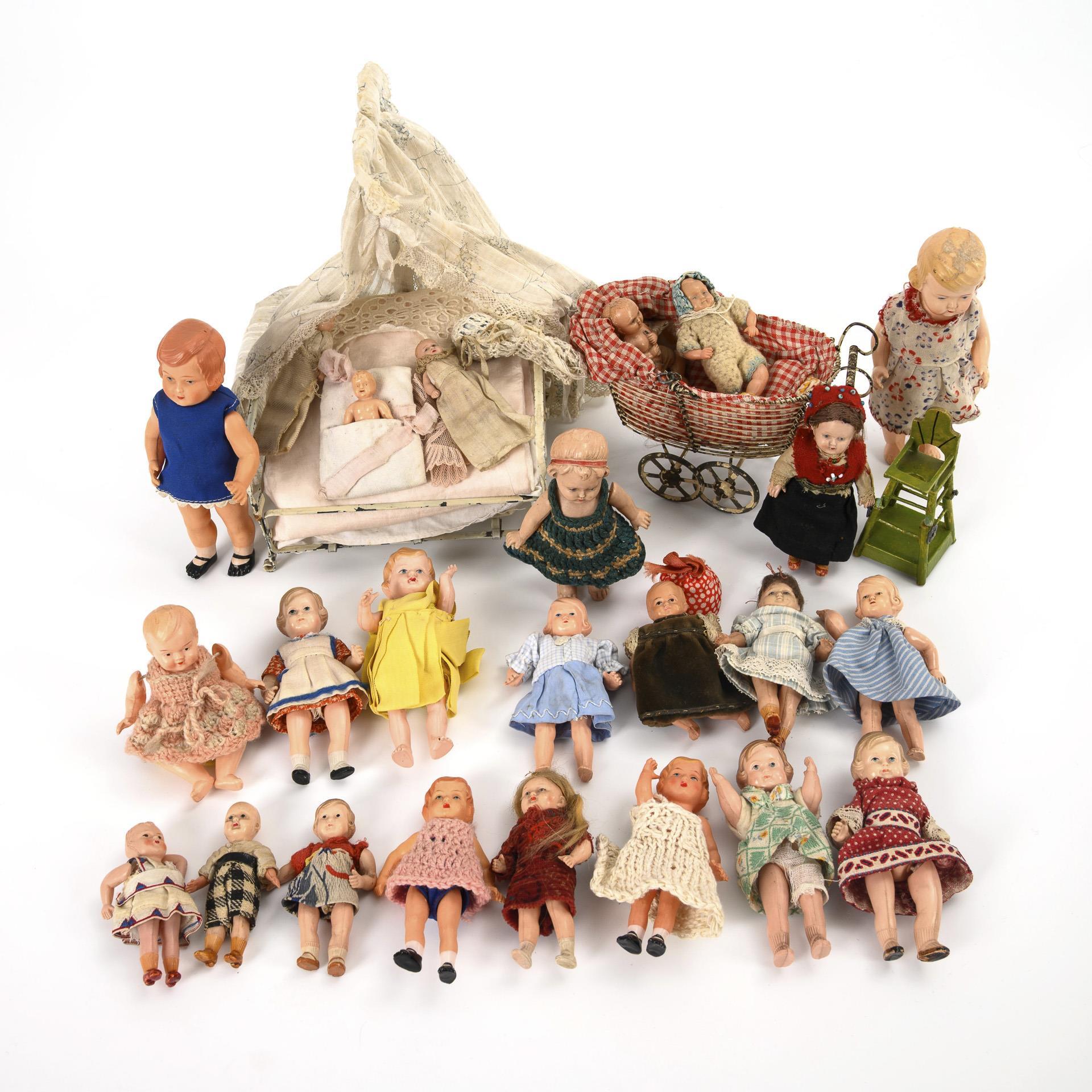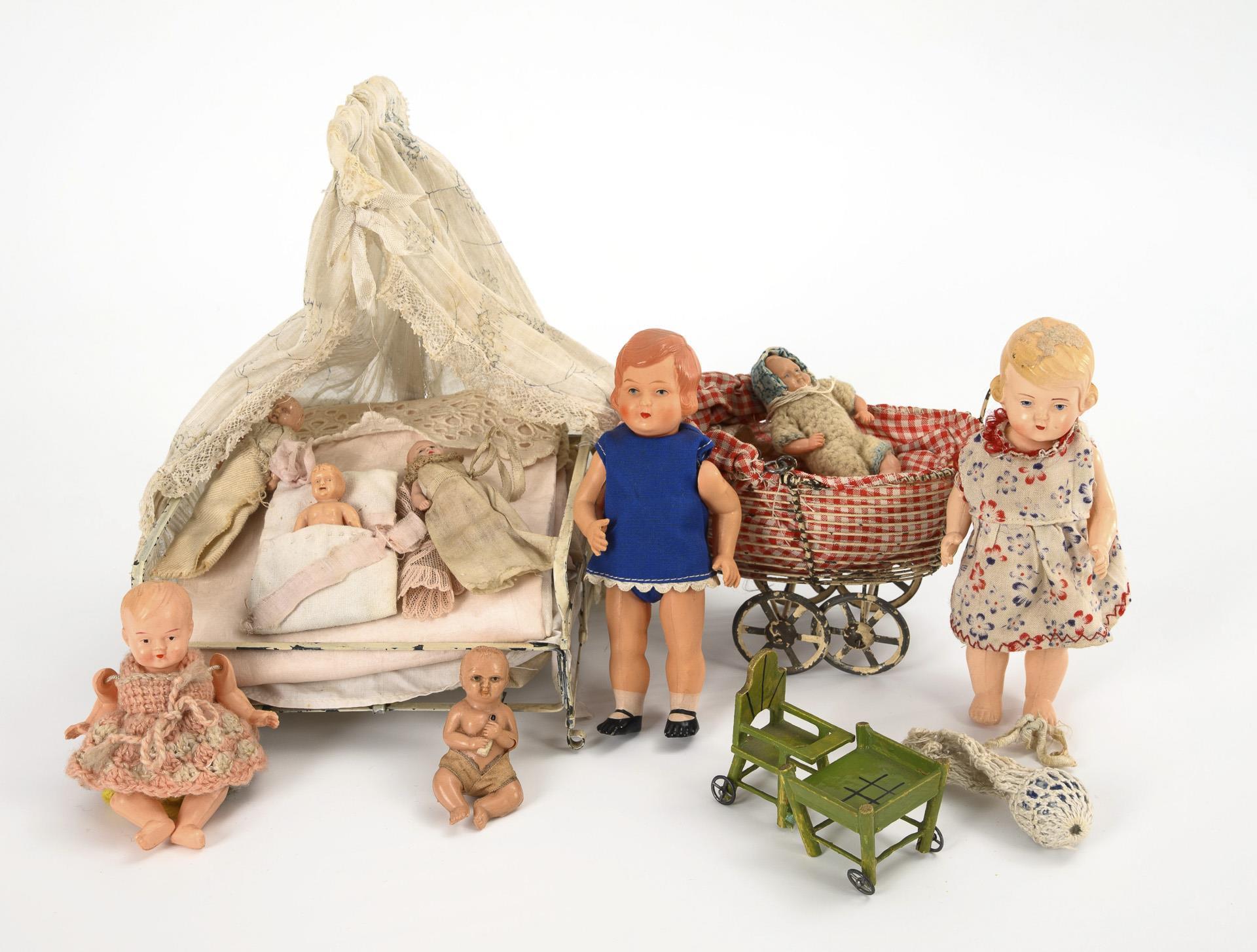 Ca. 23 Püppchen in verschiedenen Größen (L 5 - 13,5 cm), dazu weißes Himmelbett aus Metall, Draht-Kinderwagen und defekter, kleiner Hochstuhl aus grün lackiertem Holz. Stark bespielt, mit Altersspuren und Defekten.