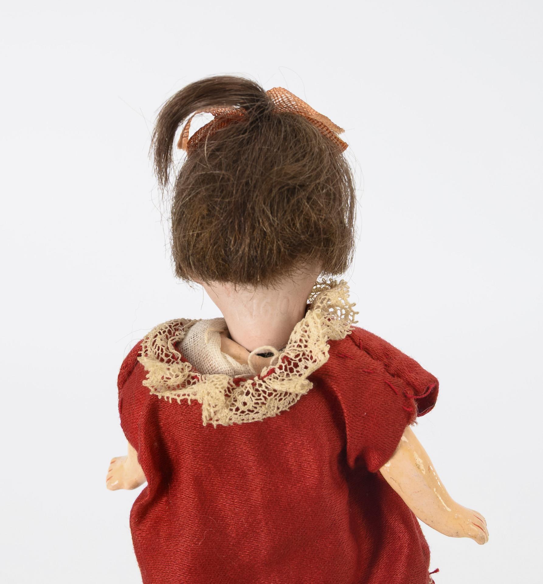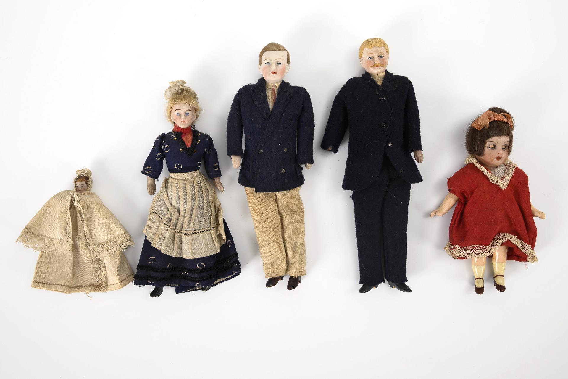 2 Herren in dunkelblauer Filzkleidung, 1x mit Schnurrbart. / Frau mit Schürze und blonden Mohairhaaren. / Miniatur-Püppchen als Baby im Taufkleid. / Mädchen mit Kurbelkopf und braunen Mohairhaaren in rotem Kleid. Altersspuren und Defekte.
