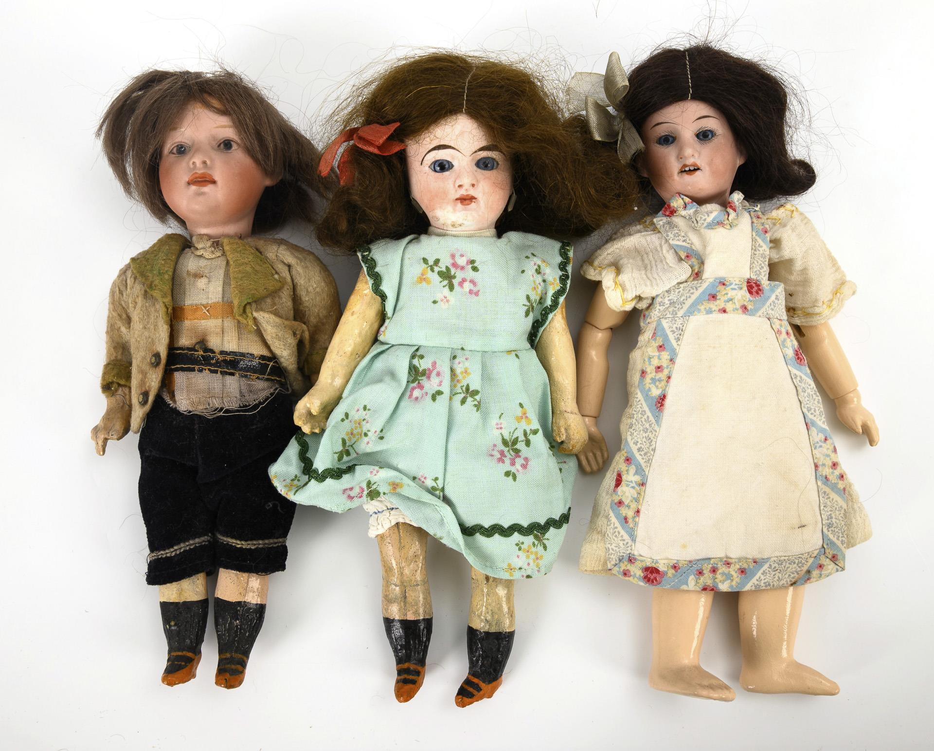 3 Püppchen mit Kurbelkopf, blauen Augen und Mohairperücke. L 21-23 cm. Dazu 9 alte Fotografien (um 1900) mit Kindern und Puppen. Puppen mit kleinen Defekten, 1x mit neuem Gliederkörper.