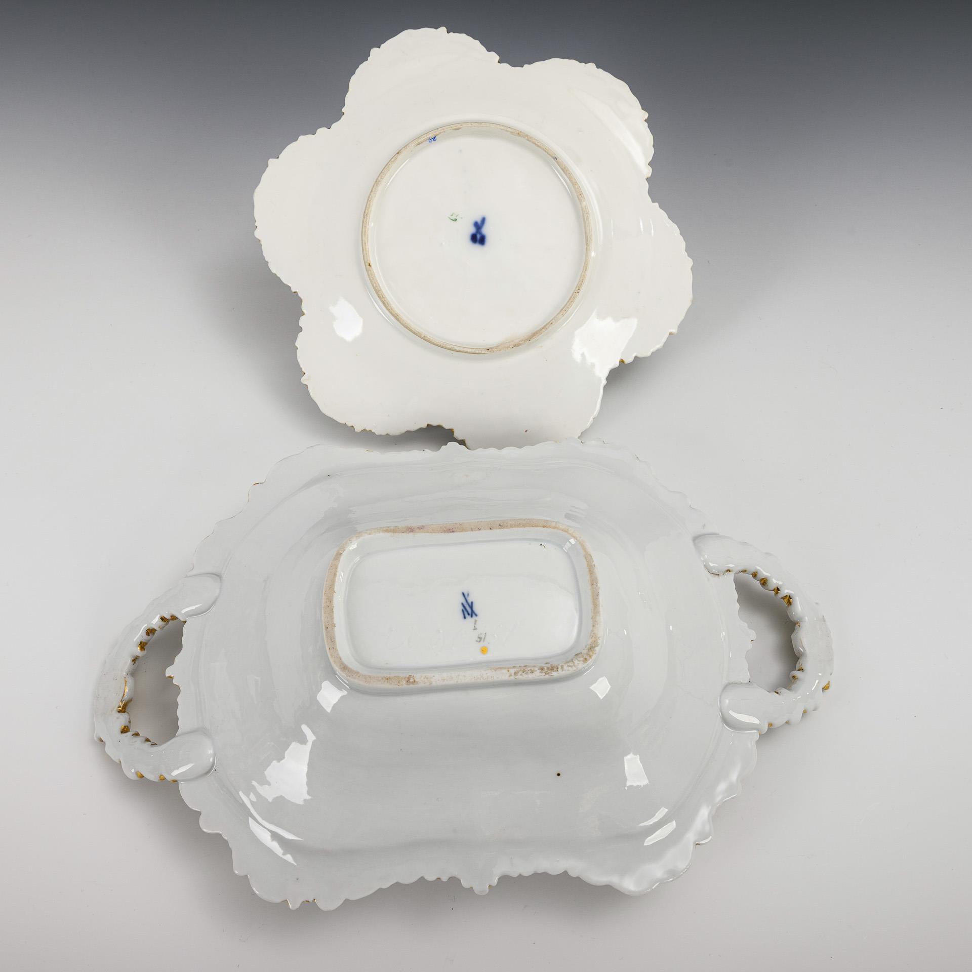 1x rechteckige Schale mit zwei Handhaben sowie Rocaille- und Blütenrelief (33 x 20 cm). / 1x sechspassiger Teller mit Rocaille- und Floralrelief (Ø 22 cm). Gold berieben.