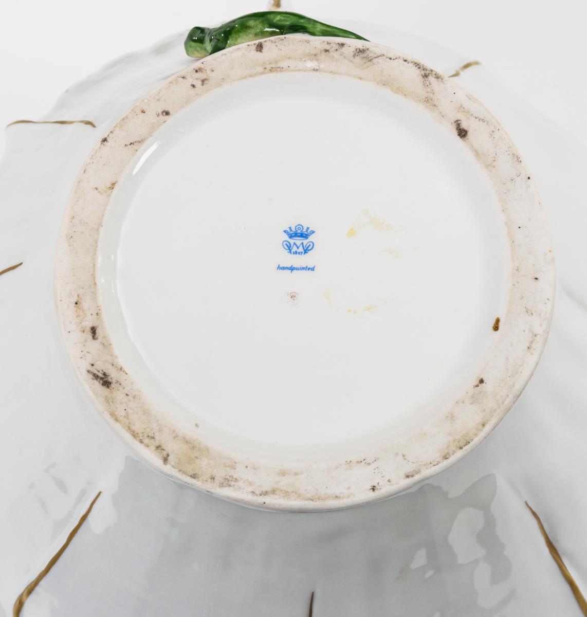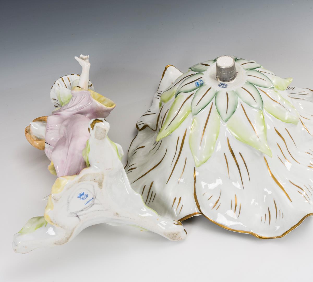 In der Art des Jugendstils gestaltet mit je einer Frauenfigur am Schaft der Tafelaufsätze bzw. auf der Schulter der Vase. Bestoßung und Haarriss an 1 Schalenrand.