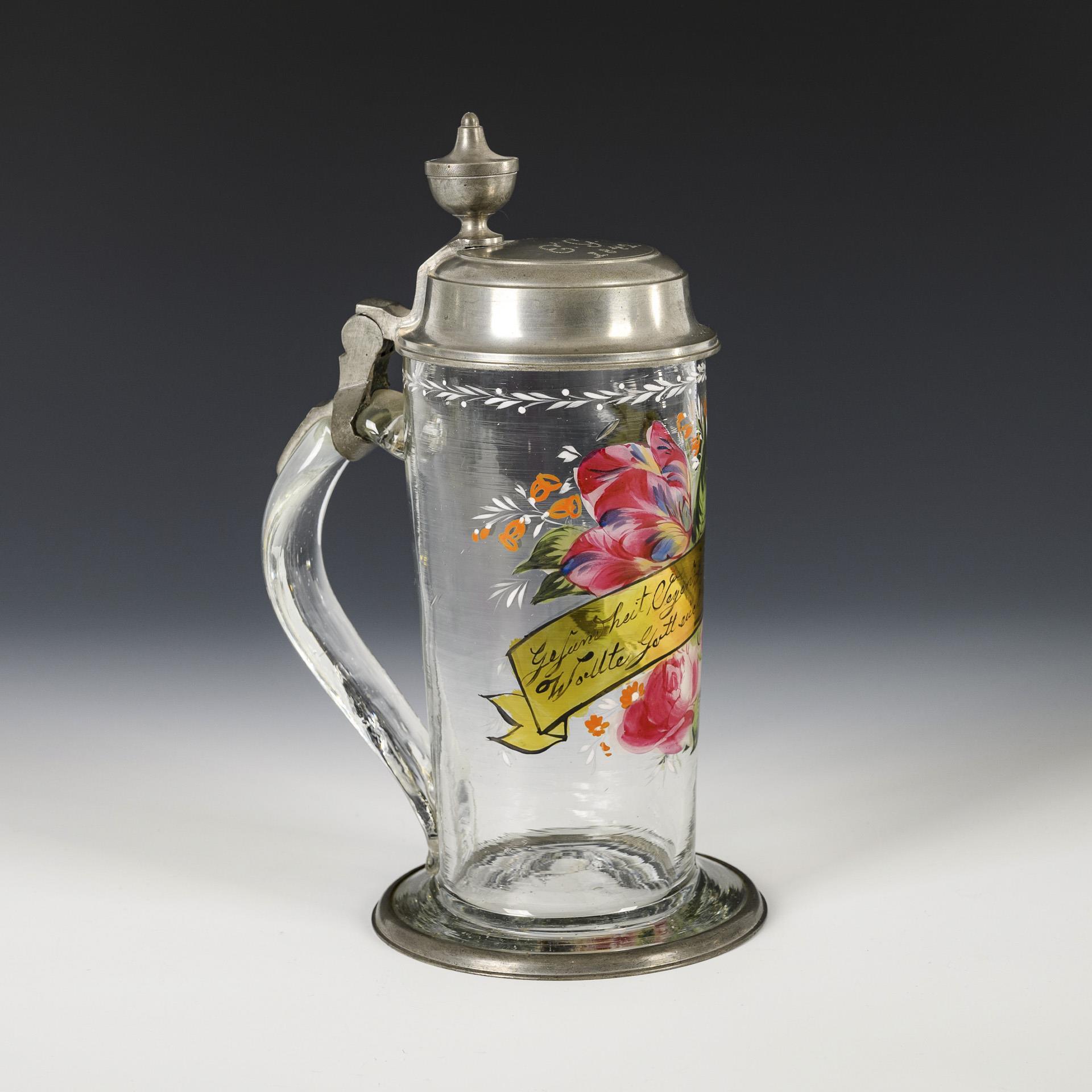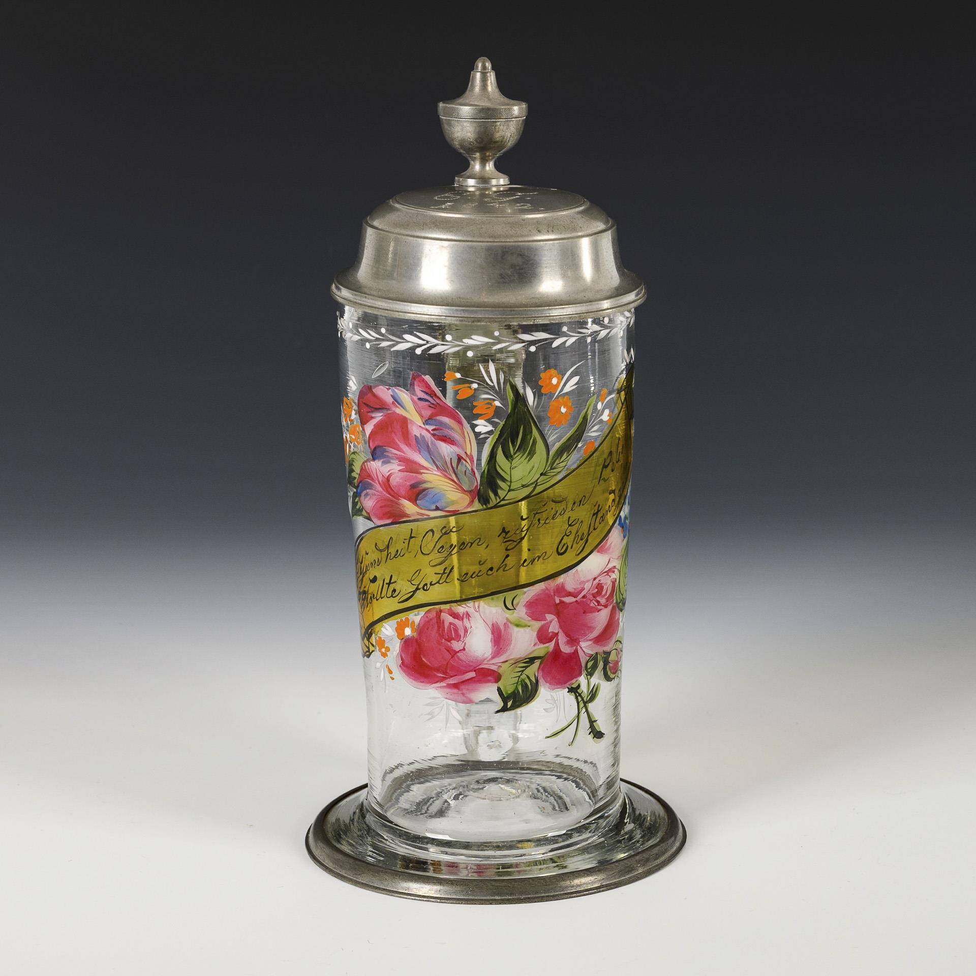 Walzenkrug mit ausgestelltem, zinnmontiertem Stand, Bandhenkel und zinnmontiertem Knaufdeckel mit der Bezeichnung "E. G. 1842."; Abriss. Schauseitig die Darstellung eines Blumenbuketts mit gelbem Schriftband, darauf der Wunsch "Gesundheit, Segen, zufrieden Leben, / Wollte Gott euch im Ehestand geben.".