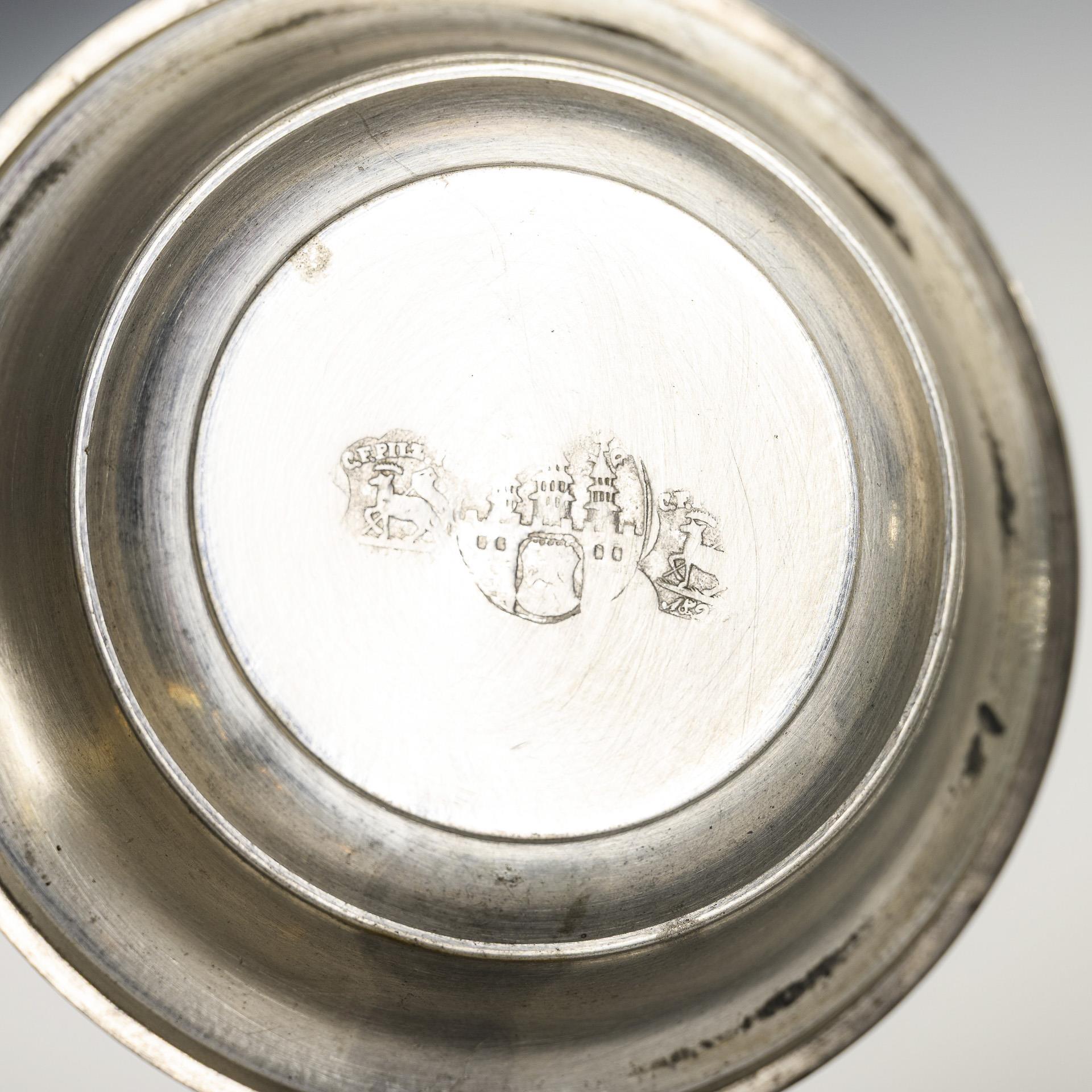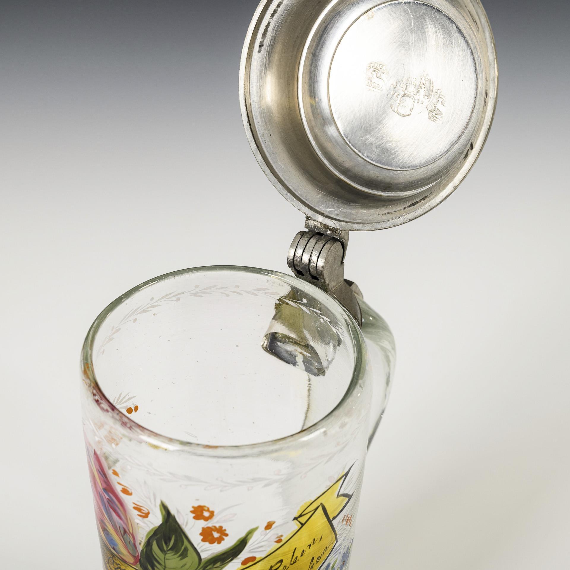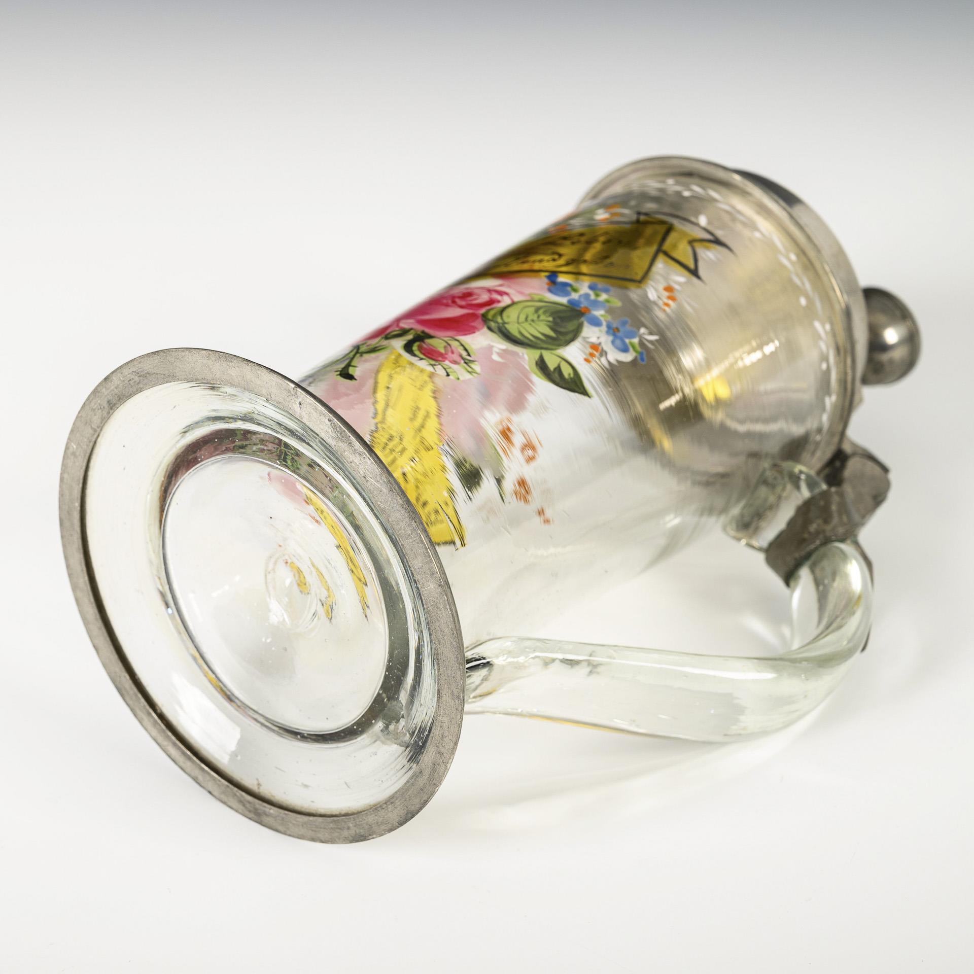 Farbloses Glas, polychrome Emailmalerei, Zinn. H 24,5 cm. 920 g.
