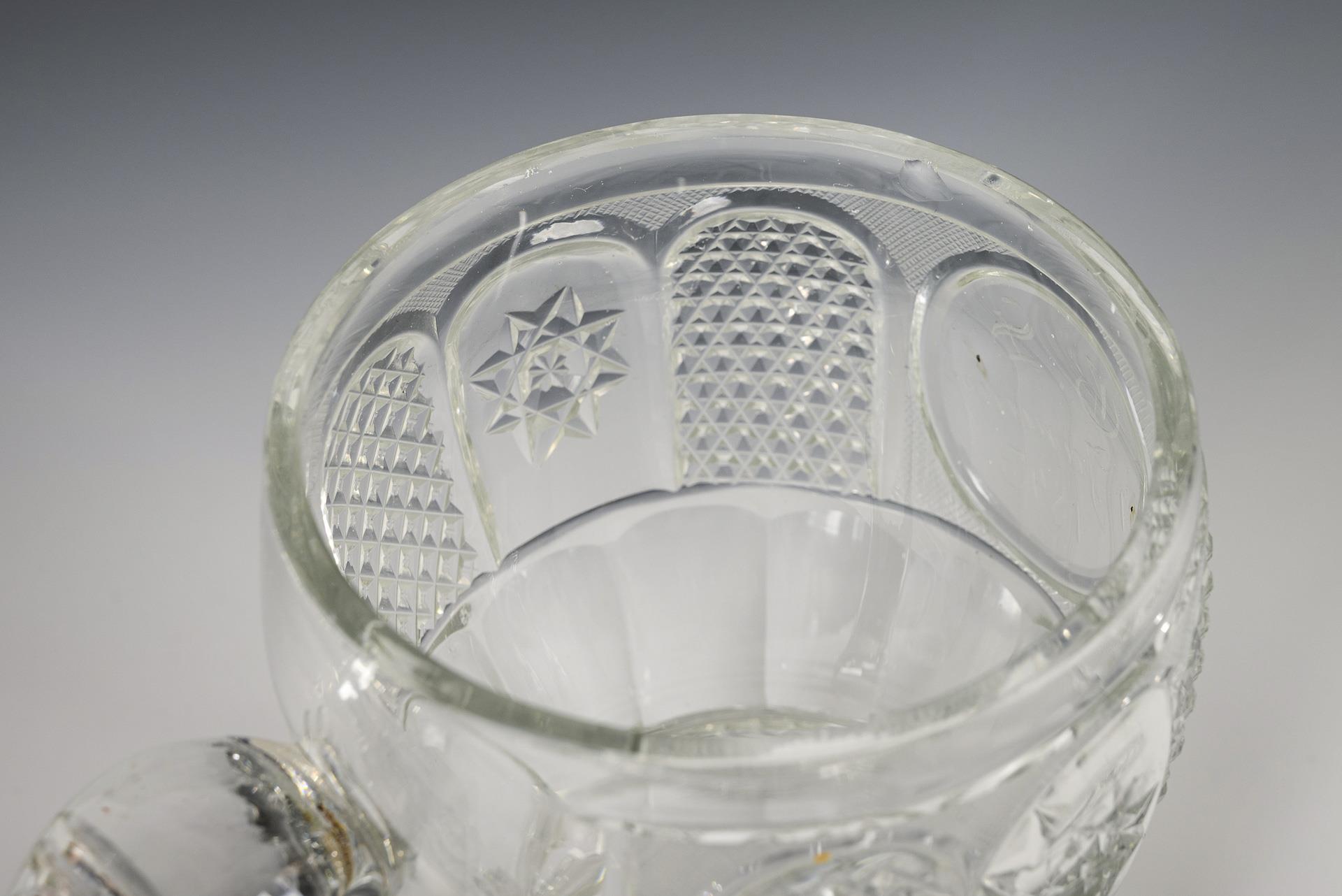 Nach oben geweiteter, mittig facettierter Korpus mit Bandhenkel und Knaufdeckel. Mit reichem Kerb- und Steinelschliff. Deckelknauf geklebt, Chip am Deckelinnenrand und am Mündungsrand.