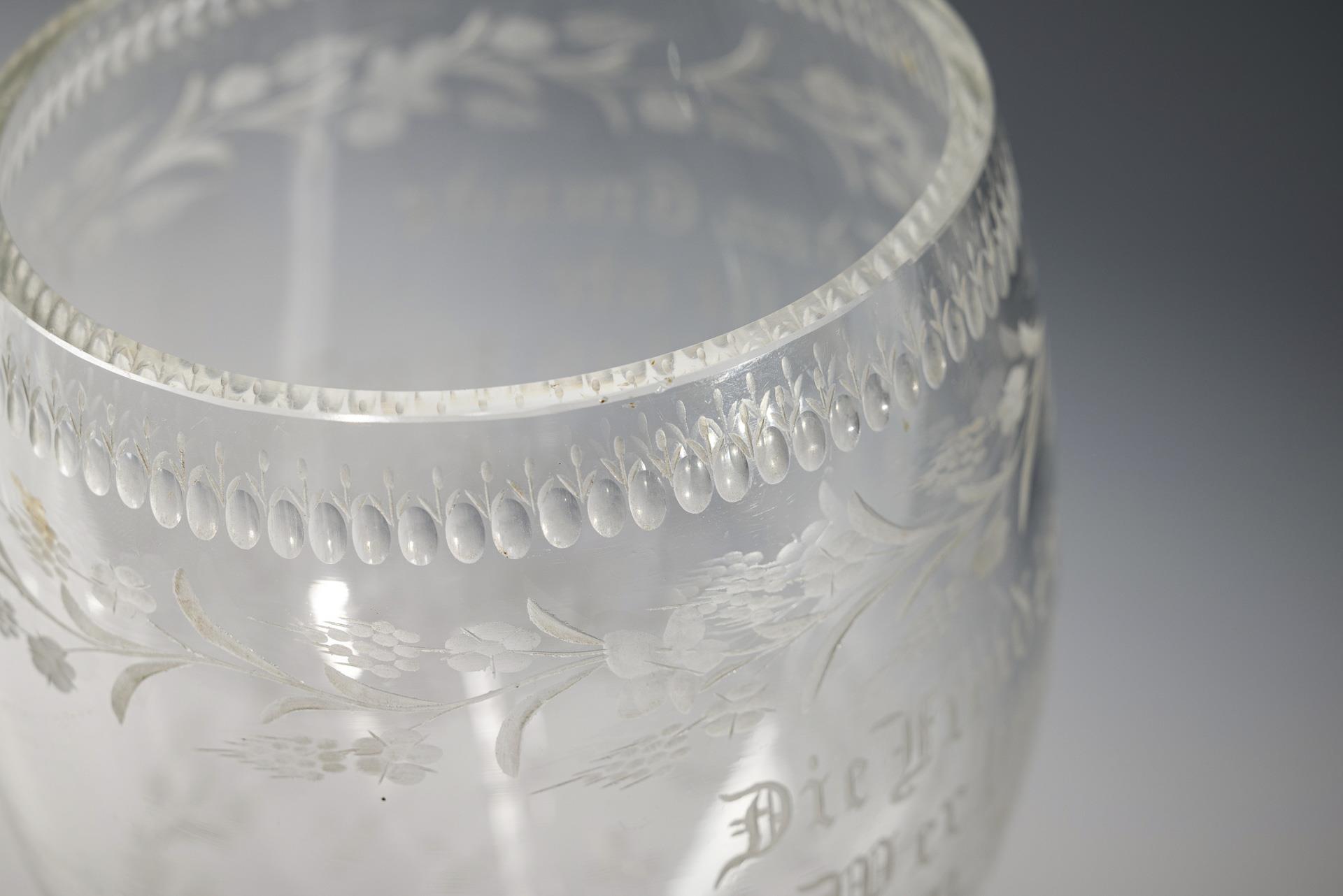 Ovoide Kuppa, konischer Nodus, glockenförmiger Rundfuß. Auf Kuppa und Fuß gravierte Ähren- und Blütenbänder sowie eine Olivenlinsenbordüre mit Stecknadelblumen an der Mündung, schauseitig der gravierte Spruch "Die Freude wohnet auf dem Grunde / Wer heuchelt, der erblickt sie nie / Drum Freunde führt das Glas zum Munde /Und trinkt rein aus so schmeckt ihr sie. ". Minimale Bestoßung am Mündungsrand (Ø 1 mm).