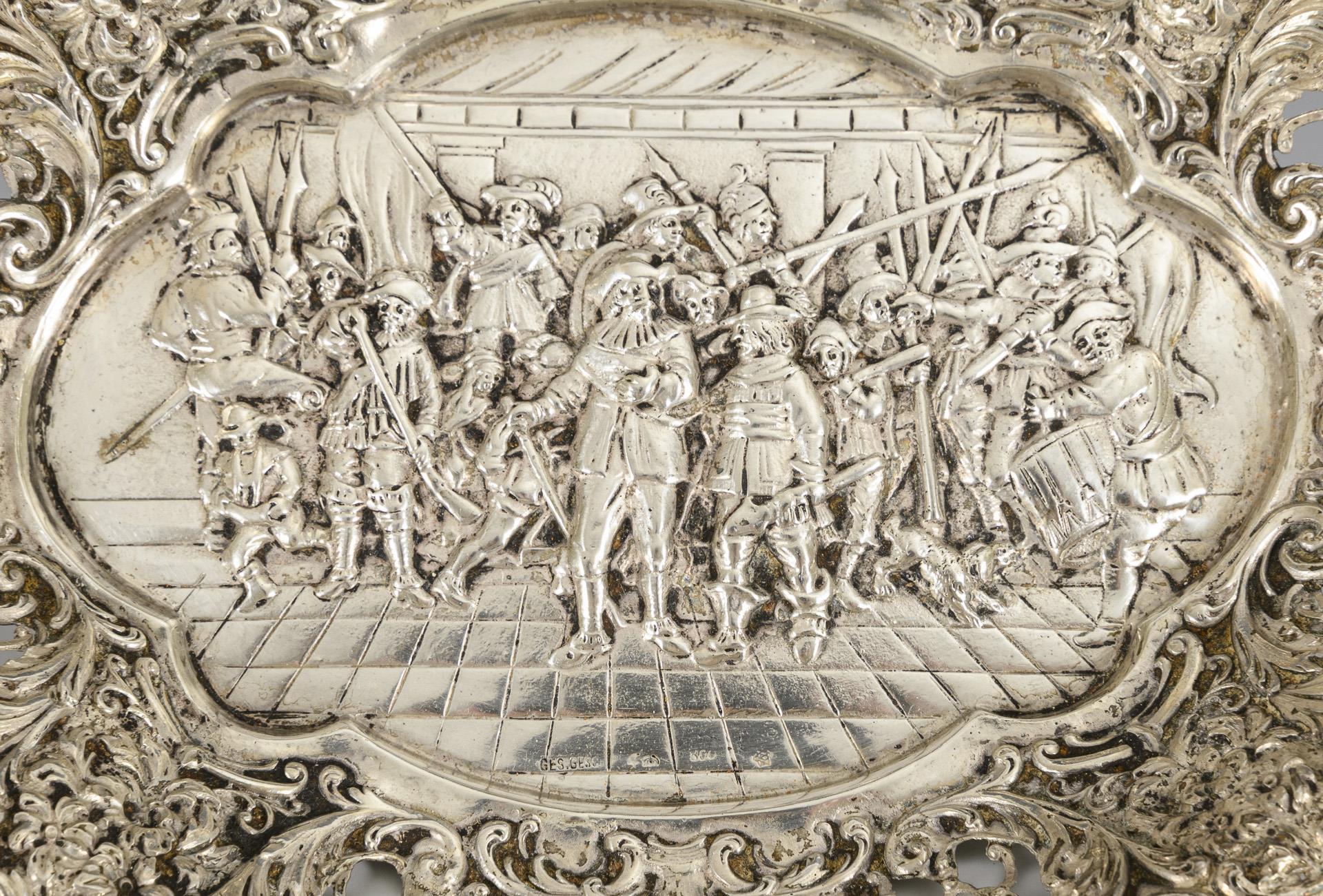 Ovale Schale mit Rembrandts "Nachtwache" im Spiegel und floral durchbrochenem Rand.