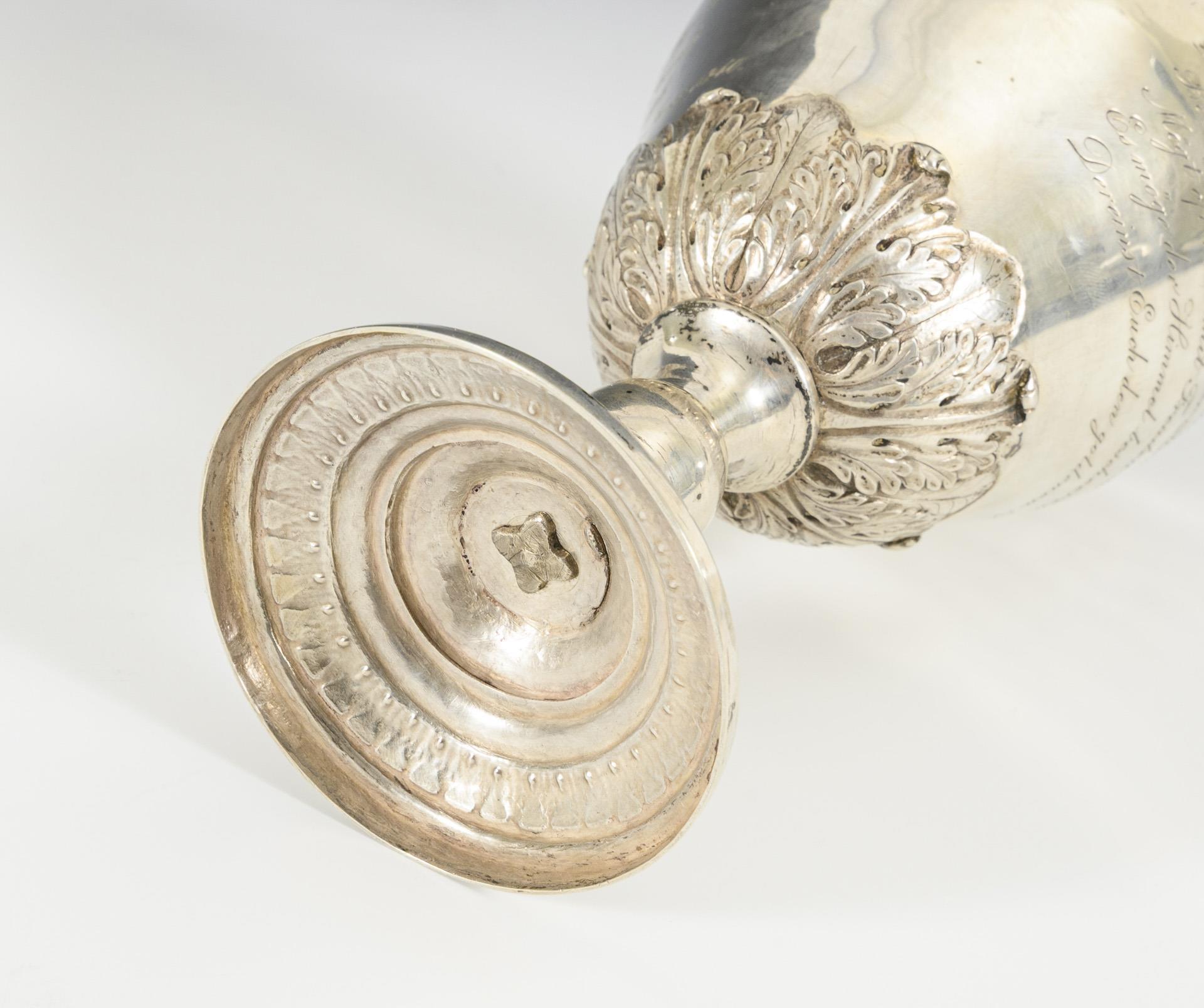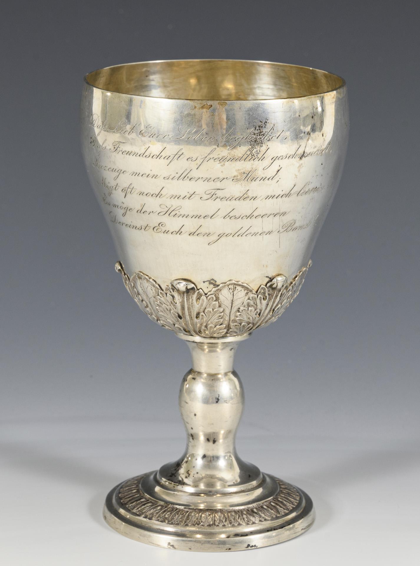 Silberpokal mit aufgelegtem Blattwerk und datierter Widmungsgravur: "Dem Jubel-Paare Johann Gottfried Herre Friedericke Herre, geb. Hecht, (...) 1840". Leichte Altersspuren.