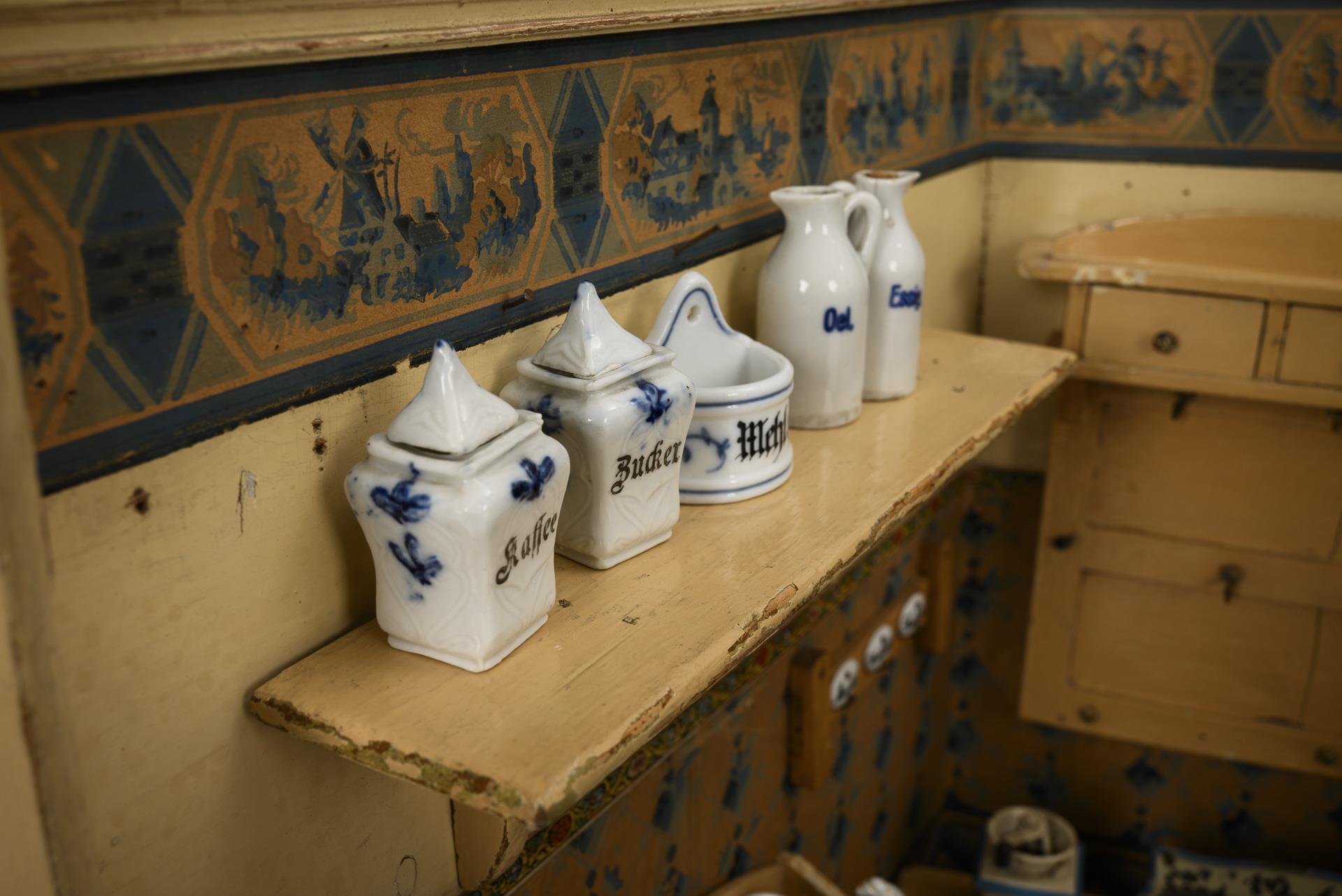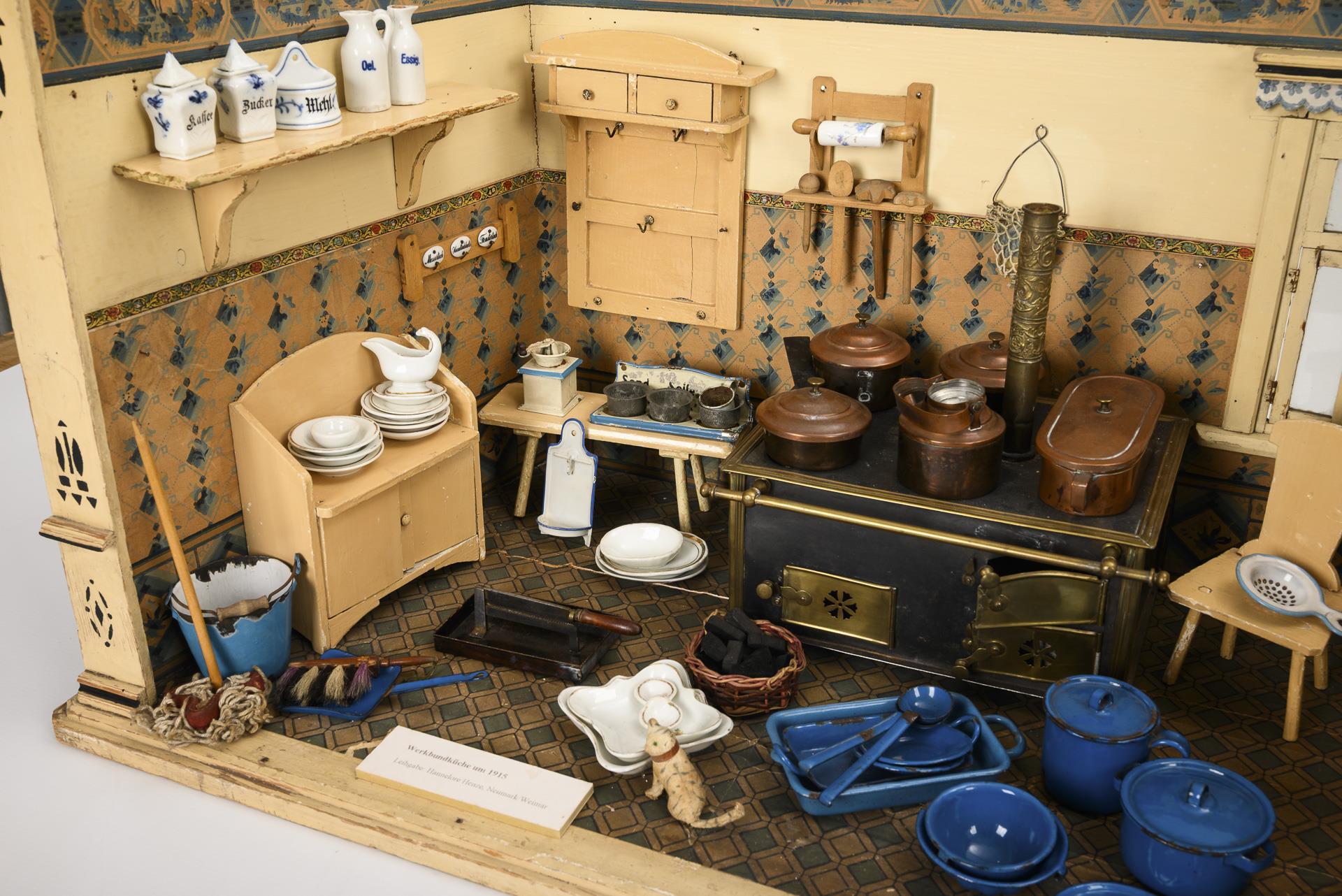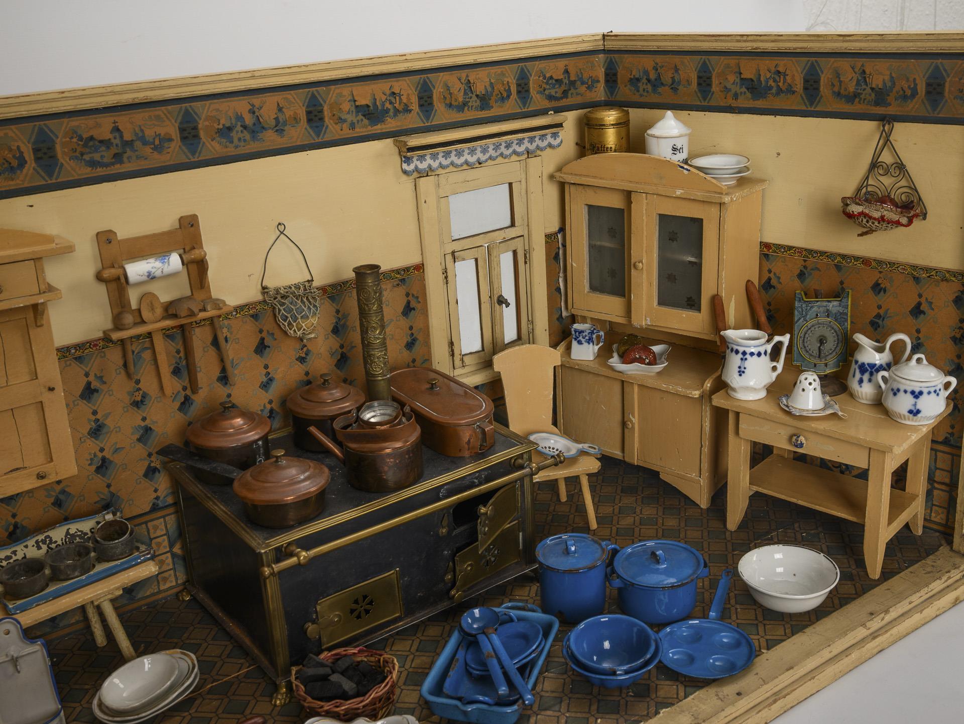 Trapezförmiges 1-Raum-Gehäuse mit verglastem Fenster und schablonierten Frontlisenen. Eingerichtet mit cremefarbenen Möbeln und schwarzem Blechherd mit Kupfertöpfen. Dazu zahlreiches Zubehör aus Porzellan und emailliertem Blech. Bespielt, mit Altersspuren und Trockenrissen.