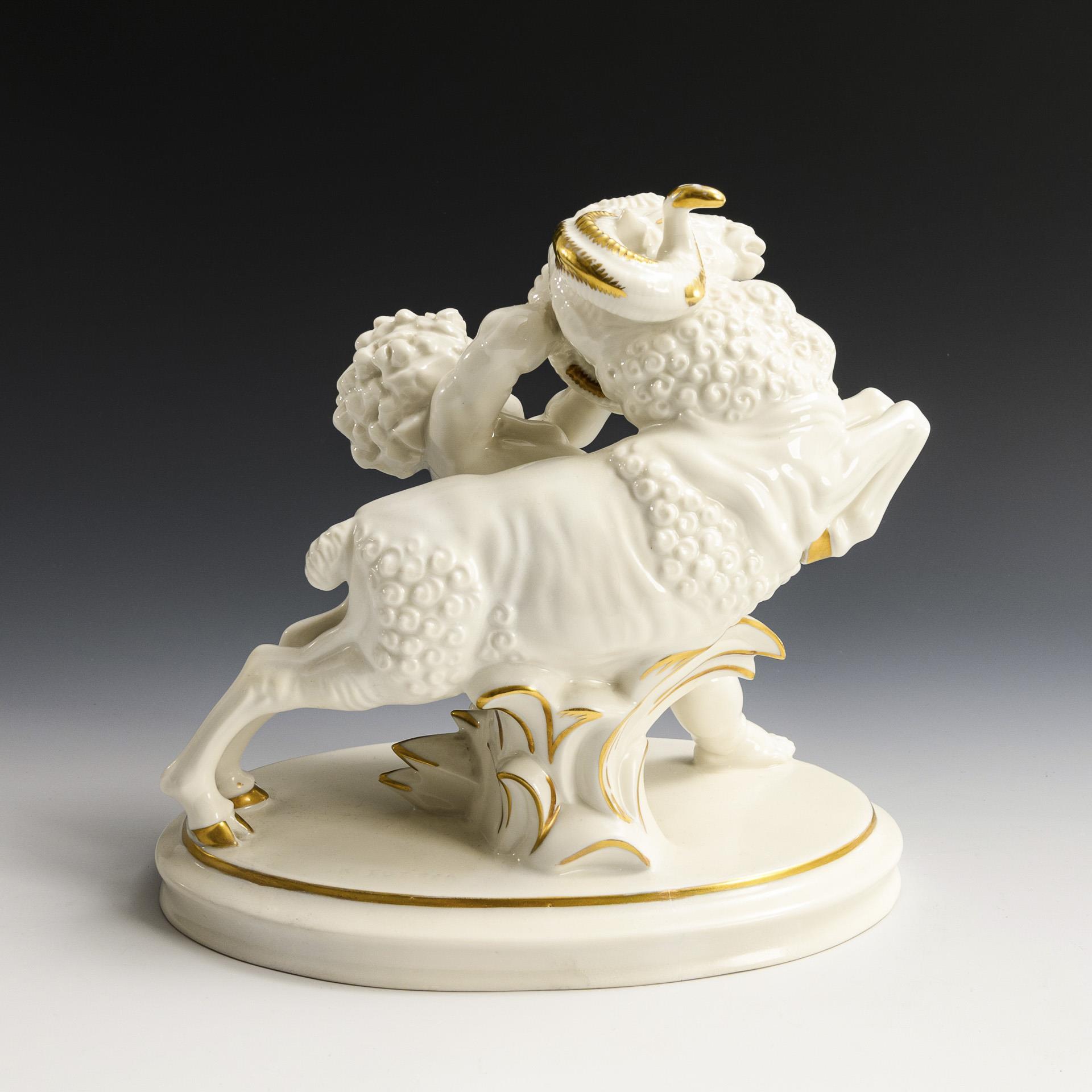 Mit einem Widder raufender Putto. Sockel und Korpus des Widder restauriert.
